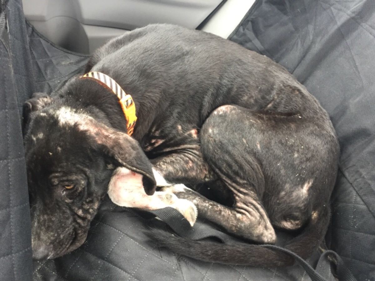 Finally, on Friday, I decided to bite the bullet and try to help. By then, Clive had warmed up to me and followed me right to my car, where I was able to pick him up and put him in the backseat. He fell asleep while we were driving and could barely get up to exit the car. I then realized the extent of his health issues - Clive was very, very ill. I was unable to care for him in that moment, so I called around to rescues and, after hitting dead end after dead end, decided the basic healthcare at Harris County Animal Shelter was better than nothing.