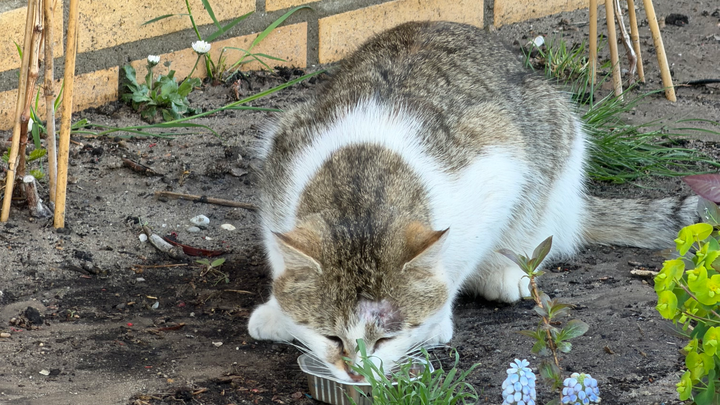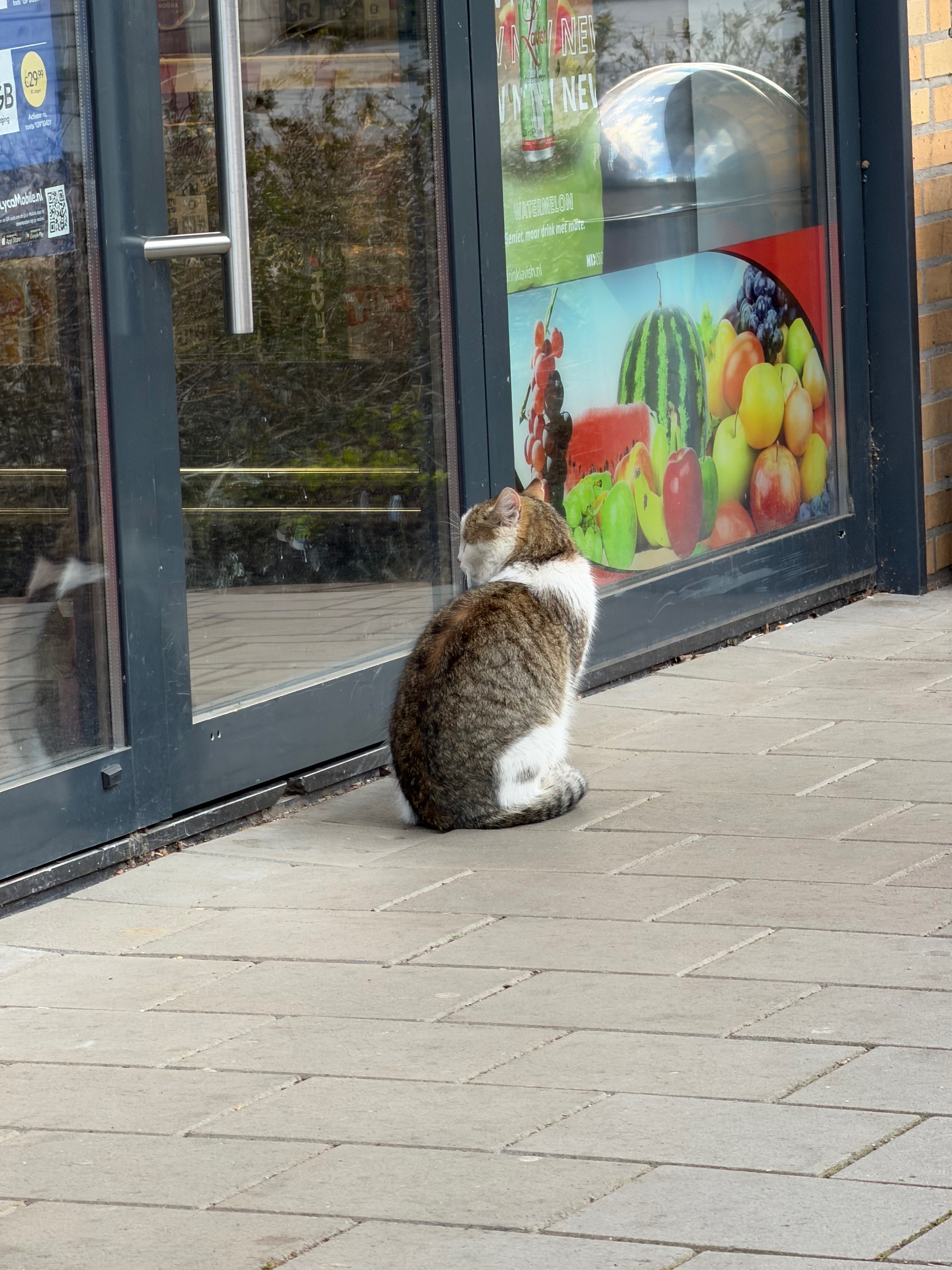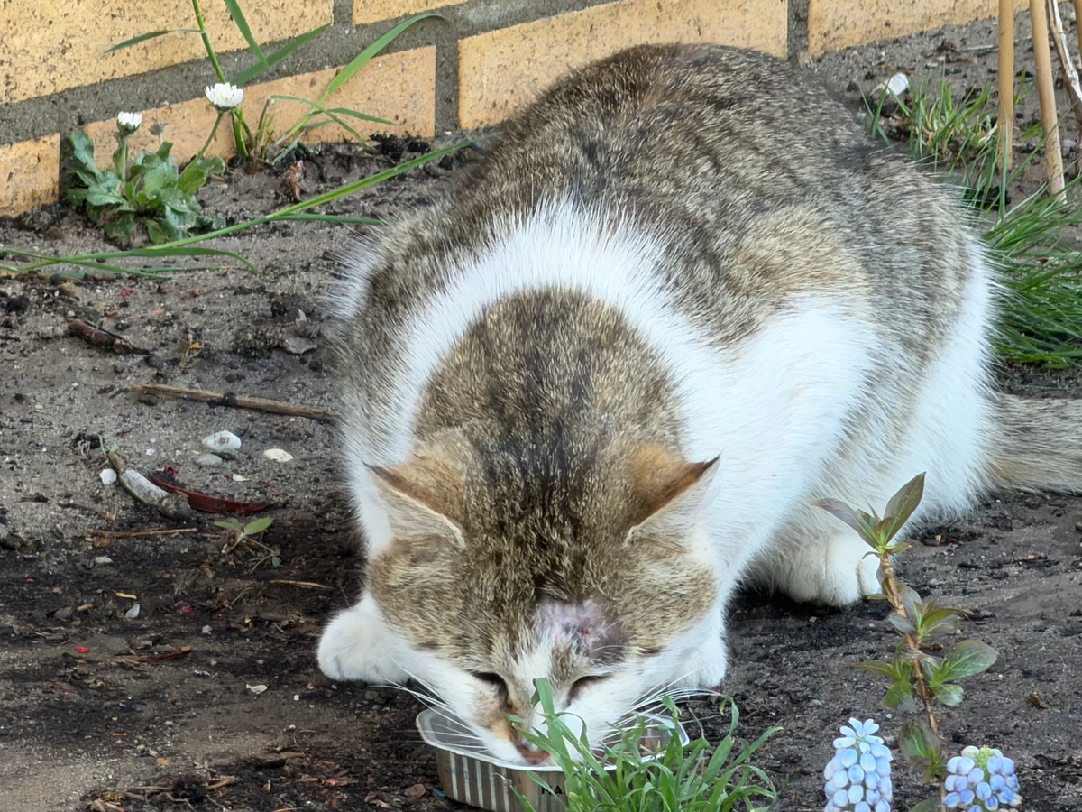 This cat has been living on the streets for several years near a store, where people sometimes feed him. He has no home and no protection from cold, rain, or heat. Every day for him is simply survival.