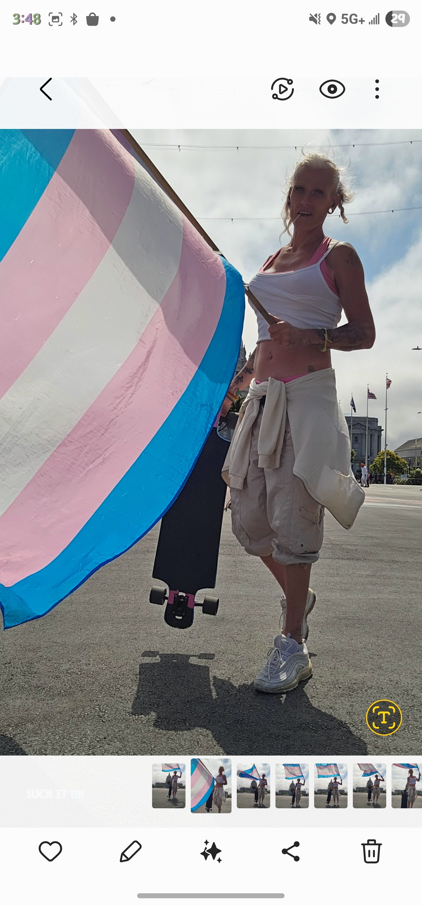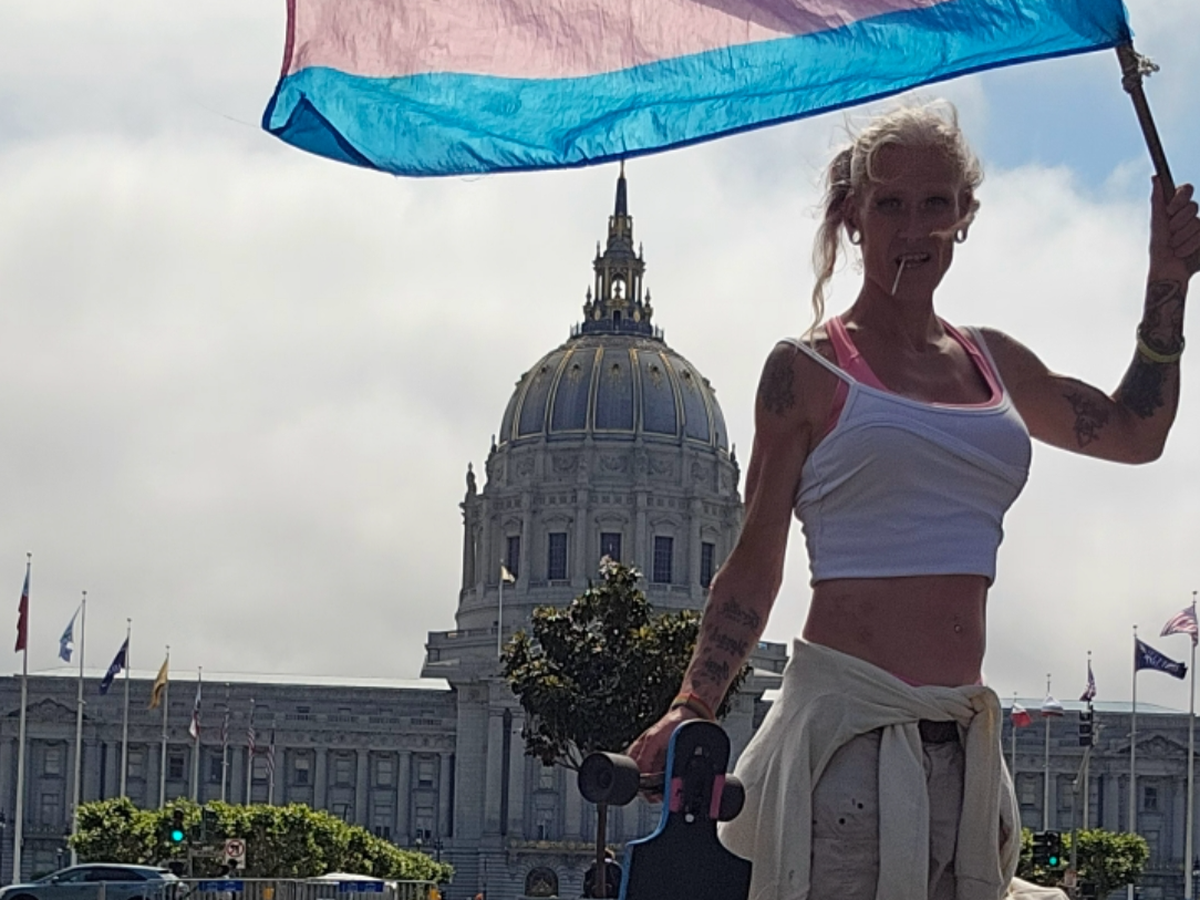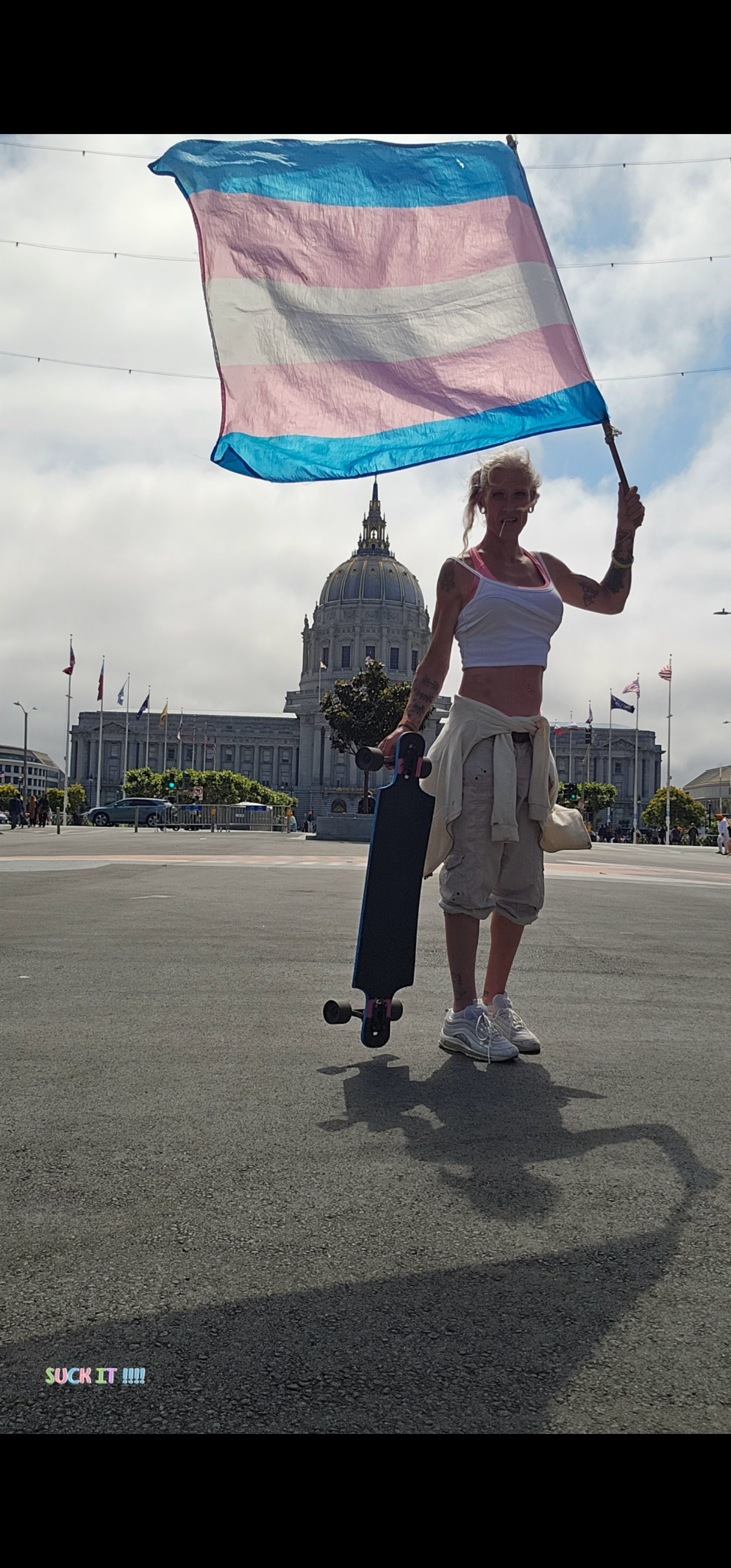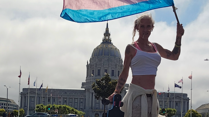 Hello i'm abbie i skateboard, San Francisco, California with a transflag, 5 days a week. I do an average of 30 miles a run with my transflag. I am very proud of who I am, but ever since the brutal murdering. Of a transgender man. Sam Nordquist was murdered february second twenty twenty five