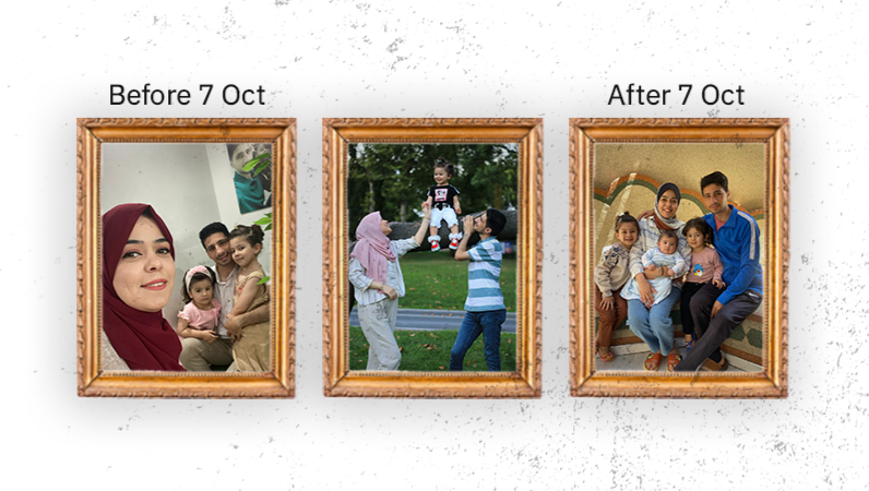 "From left: The first photo shows the family before Yaman's birth, during the summer of 2023. The second was taken during a three-year stay in Turkey where Yarin was born. The third photo, on the right, shows the family during the displacement in Rafah and after Yaman's birth, at the end of April 2024."