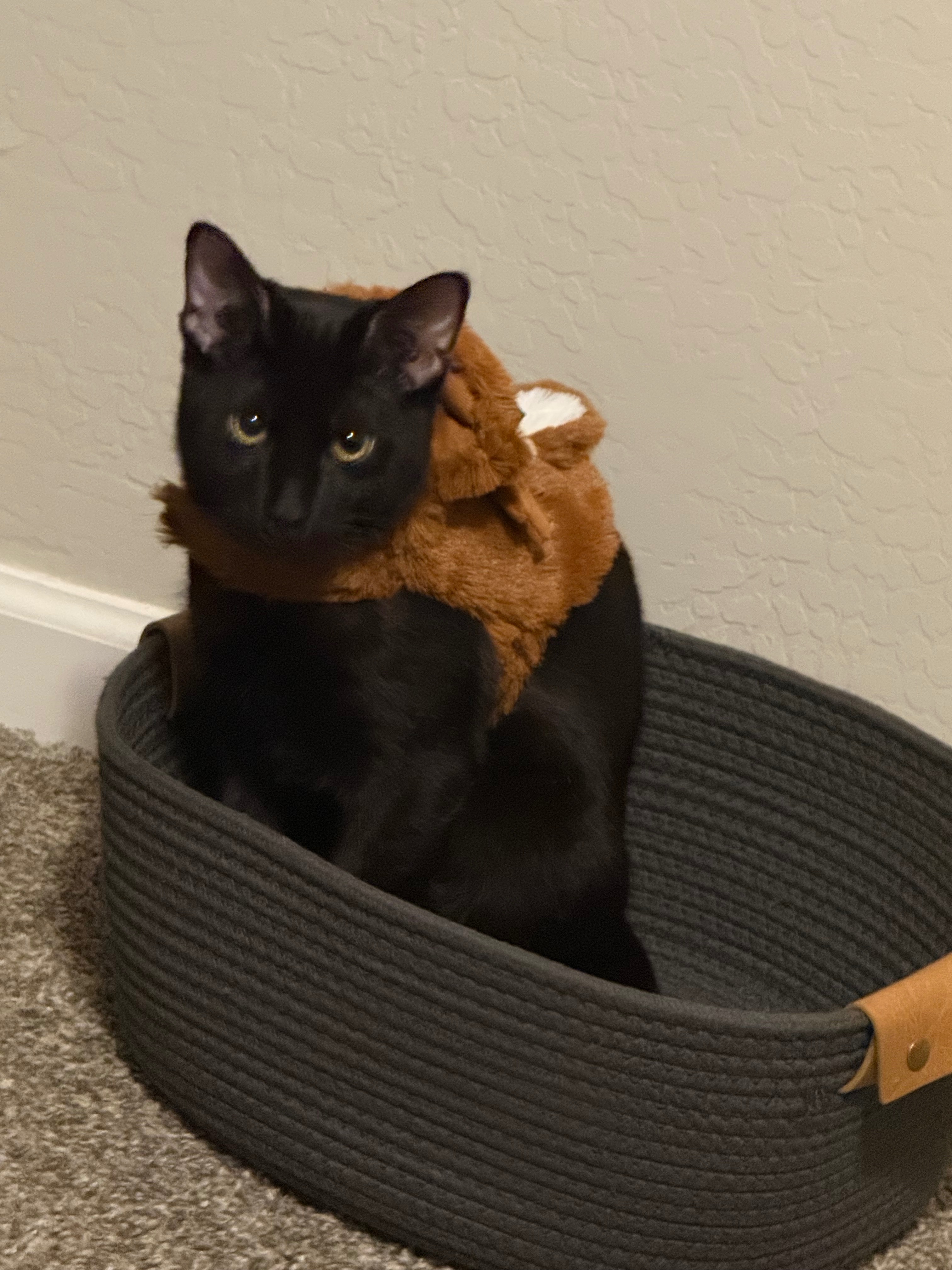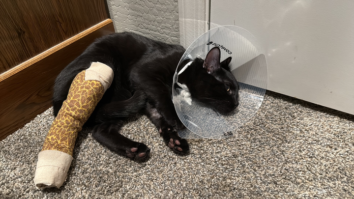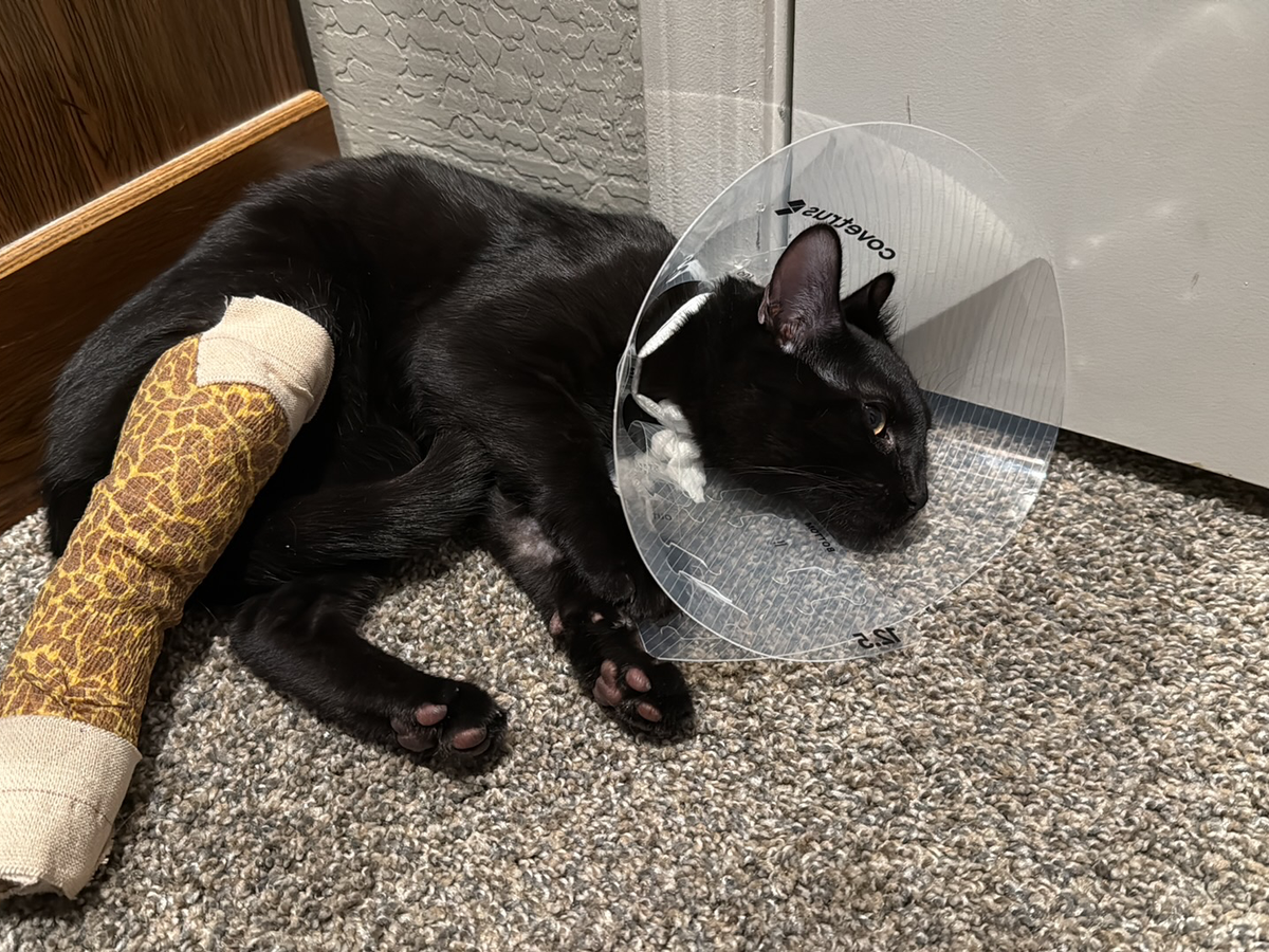 Ace is my 6-month-old black American Shorthair, and he’s been a wild, loving companion since I brought him home at just one month old. Life with Ace has been full of energy and joy, and my siblings help care for him when I’m working graveyard shifts. On December 2nd, while I was at work, my brother tried to calm Ace down by taking him downstairs. Unfortunately, he slipped on the carpeted steps, and Ace jumped from his arms, tumbling down the last 7-8 steps. When Ace landed, he hurt his back right leg and started limping, with swelling quickly appearing.