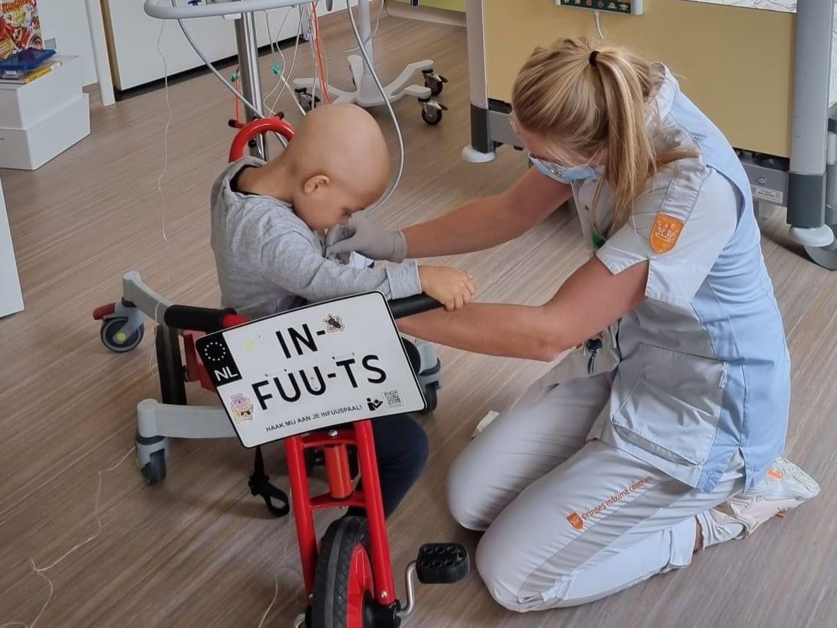 After previous doctor visits, Adam is diagnosed with Neuroblastoma on Aug. 25, 2022. A tumor of about 6.5x5cm in his adrenal gland with metastases throughout his body. At that moment, our world briefly collapses and a long journey of many therapies begins. The first series of chemotherapy does not do what we so hoped and we divert to another form of chemotherapy. This one does work and provides relief, but even then, we are far from there. Adam receives MIBG therapy after many courses of chemotherapy, which involves administering radioactive iodine for which he spends 2 courses of 5 days alone in a special isolated room. Again Adam, tough and positive as he is, does this like a real little hero. This is followed by an operation, heavy chemotherapy and radiation therapy, before being allowed to start Immunotherapy. During the less severe cures Adam is only too happy to cycle around on the infusions in the Prinses Maxima Center. (photo)