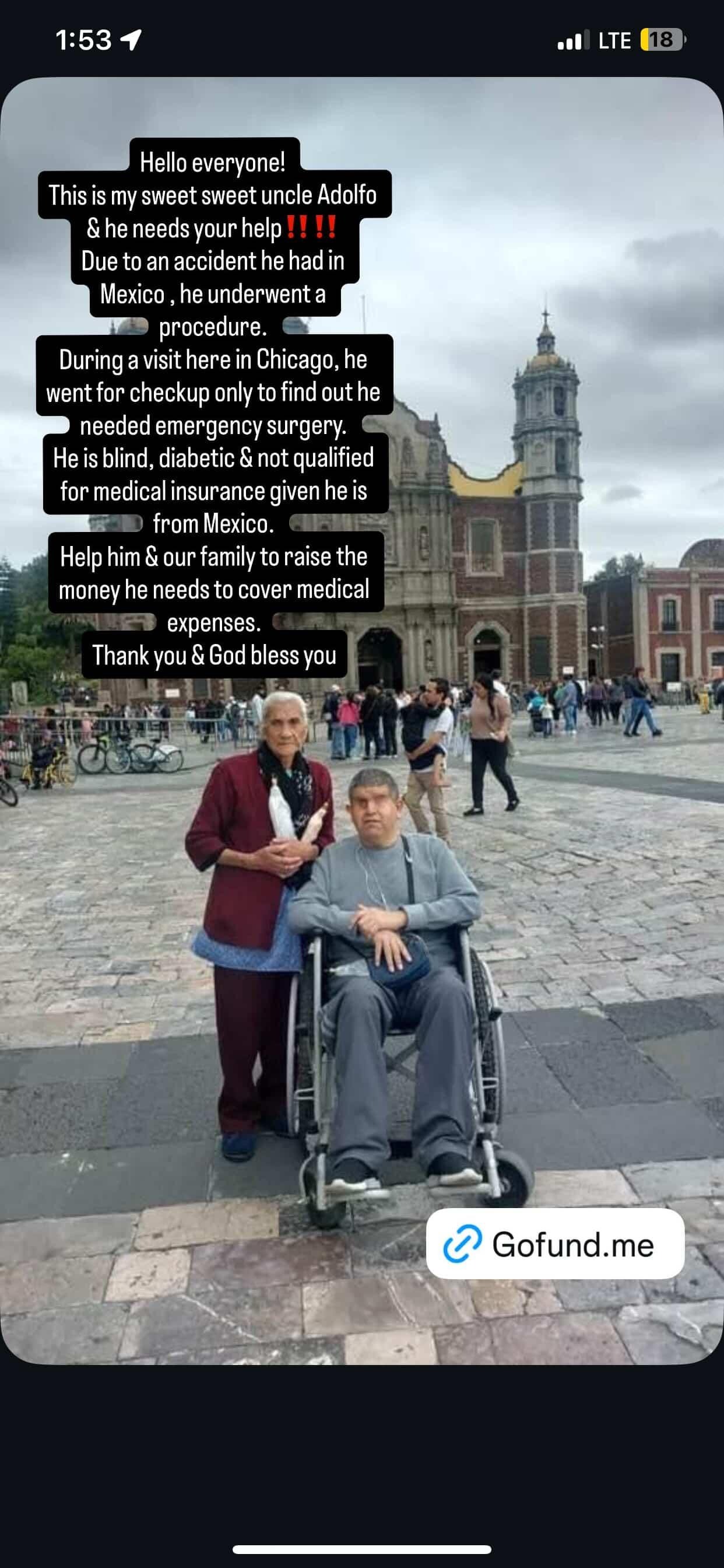 He underwent an emergency surgery due to the severe infection that he developed that spread into his bone. My uncle Adolfo is blind and diabetic and lives with his mom, who is 80 years of age and is the head of household to his children.