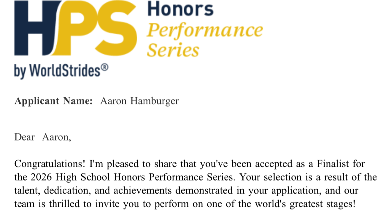 I am writing to share an incredibly proud moment for our family. Our son, Aaron Jr. (AJ), has been accepted as a Finalist in the prestigious Honors Performance Series and is invited to perform at Carnegie Hall in New York City this coming February, 2026.