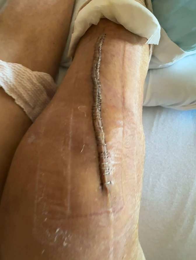 After eventually recuperating from the earlier ailments, and while trying to complete what he thought would be his final semester (fall semester of 24), his horrible luck continued. This time it was a serious injury. He fell off a horse, breaking both wrists and his right leg in November of 2024. Given that it was a complex break his operating doctor inserted a metal plate to help his leg heal correctly. Unfortunately, after several months of increasing pain and immobility, he had to return to the hospital for tests that revealed that the metal plate had caused a serious infection, necessitating a second surgery in October of 25 to remove the plate. I've enclosed a picture showing the snake-like incision made during the second operation. That successful operation has paid off, as he now has almost no pain, exercises daily based on his post-acute care facility's physical therapy routines for his knee, and rebuilding his leg muscles. He has been walking with a cane although at times he's had to use a wheel chair, but he told me that he recently walked around school without his cane.