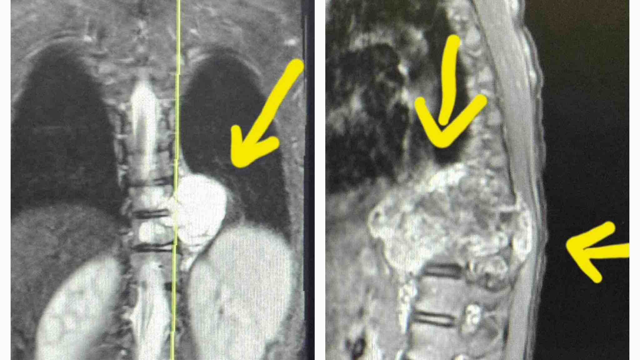 Emergency surgery was performed to remove as much of the tumor as possible from the spinal cavity to relieve pressure on the spinal cord and hopefully restore some function to her legs. The tumor has also damaged the bones in her spine, requiring reinforcement or reconstruction of sections of her spine to prevent collapse when the tumor is removed.