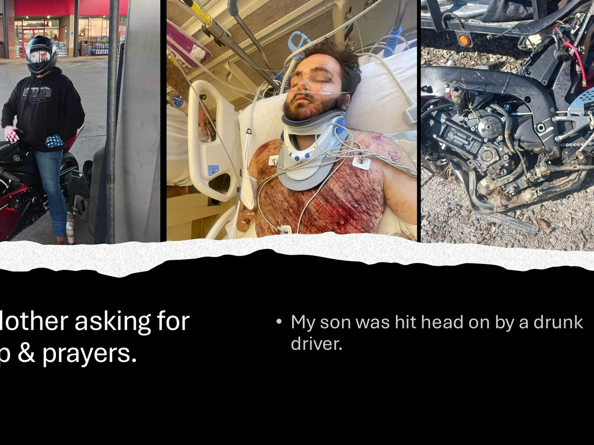 On October 1st, my son was hit head-on by a drunk driver while he was riding his motorcycle. He was taken to UT Medical Center and was in Surgical Trauma ICU for 5 days, and now we are on another floor. He has a fractured skull in the back and will be in a neck brace for 2 months. He has had around 8 surgeries on his left knee due to his skin being ripped off his knee and the rest up to his thigh being de-gloved, trying to clean everything out of his leg. He ended up in a ditch that was filled with murky water, so it’s been very hard to clean. He broke his left hip and had a plate screwed into it. He broke his left shoulder, and they did surgery on it, but it popped out again, so he had another surgery. His left heel was de-gloved as well, and the skin and cells ended up dying, so they had to cut all the dead out of it. Now it’s up to the plastic surgeon to come up with a way to make and repair the cells and skin together. He broke both his wrists and has plates and screws in those. He has a lacerated spleen that caused him to lose a lot of blood in the beginning, but he hasn’t lost any more in a few days. He broke his left thigh bone and had to have surgery to repair it, and that’s going to require multiple surgeries to come. His left middle finger had to have some of it amputated. His white blood cell count is supposed to be 10,000, but it’s staying around 20,000 or higher. There is just so much going on with him, and he has a lot of trauma. I honestly don’t think I could think of it all right now.