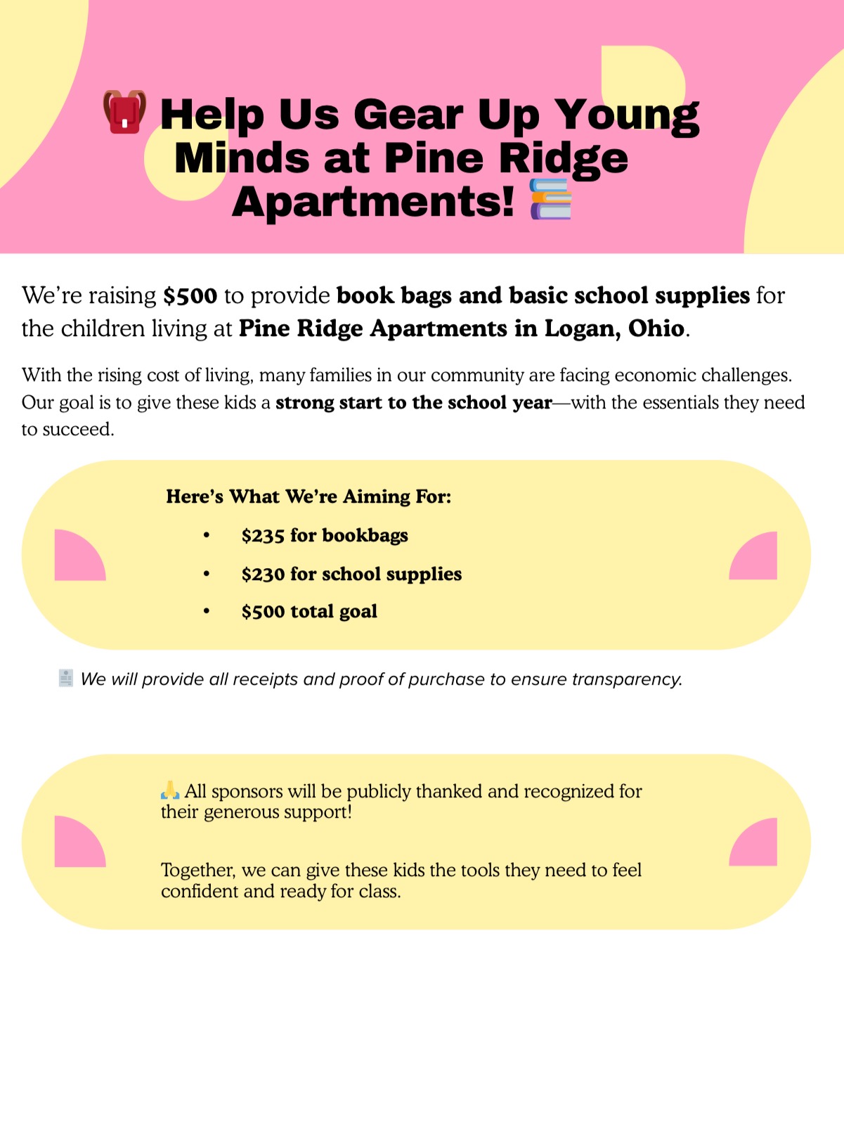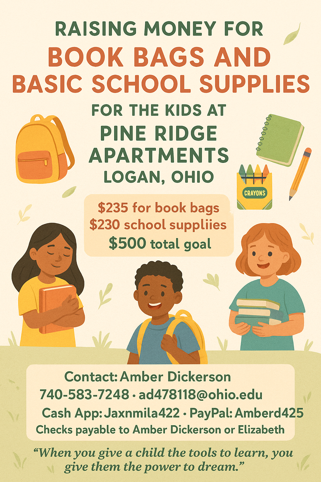 Hello, my name is Amber Dickerson, and I live in the small town of Logan, Ohio. There’s a wonderful community here at Pine Ridge Apartments, and I’m reaching out to raise money for book bags and basic school supplies for the children who live in the complex.