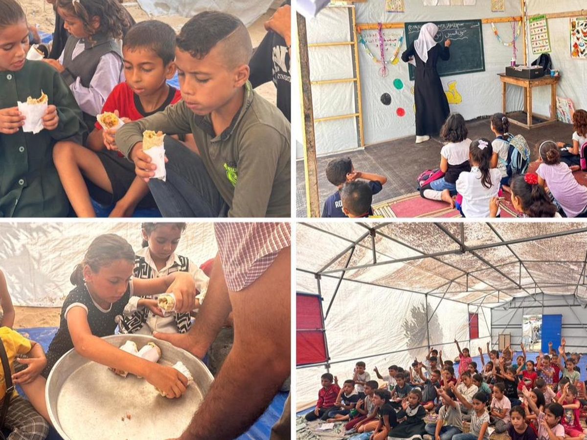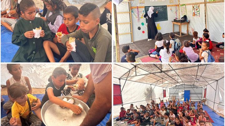 With more than 625,000 children out of school and most school buildings damaged or destroyed, Amwaj has also created temporary learning spaces in shelters in Mawasi Khan Younis. There, children aged 6–12 receive basic education in English and maths, along with psychosocial support to help them cope with trauma.