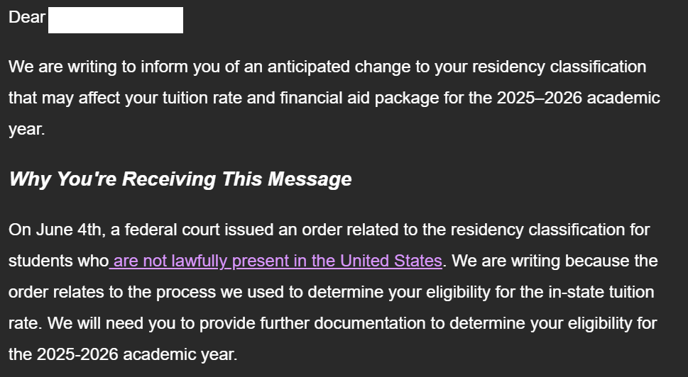 On June 4, 2025, the Texas Supreme Court struck down the Dream Act’s in-state tuition protections. Overnight, my tuition bill tripled. This Fall, I owe $12,850, and because I already used an emergency institutional loan in Spring 2025, I no longer qualify for one now.
