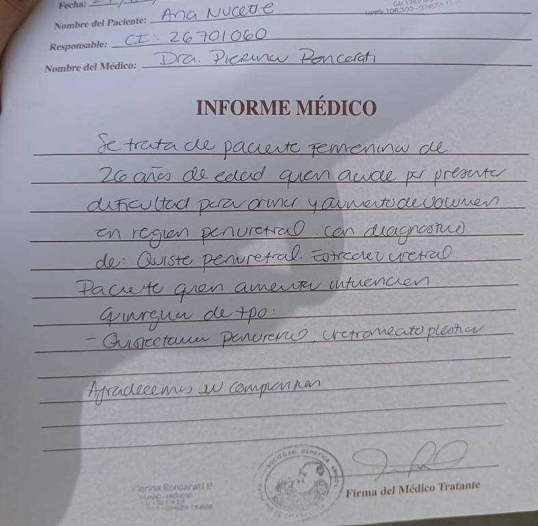 Hola a todos, nos dirigimos a ustedes con el corazón en la mano para pedir su apoyo para mi sobrina Ana Nucette, de 27 años, quien vive en Maracaibo, Venezuela. Ana ha sido diagnosticada con un quiste parauretral. Este crecimiento está ubicado directamente en su uretra, causándole dolor severo y constante, sangrado al orinar e infecciones recurrentes que afectan su bienestar general.