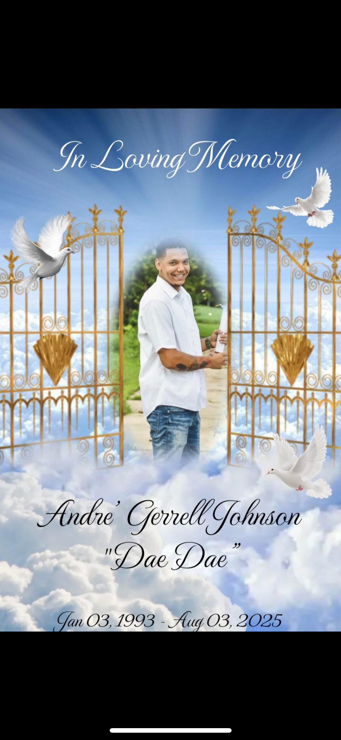 Andre Johnson, (also known as ”Dre” to many) born January, 3rd, 1993 tragically passed away on Sunday, August 3rd, 2025 at only 32 years old in a fatal car accident. Andre was a man of faith, a loving & supportive husband, a devoted Father of two beautiful children (a 9 year old son & a 4 year old daughter) who were the light of his life who he referred to as his “little Angles." Andre was a caring and devoted son, a protective Brother to his two younger brothers whom he helped raise in a single parent home.