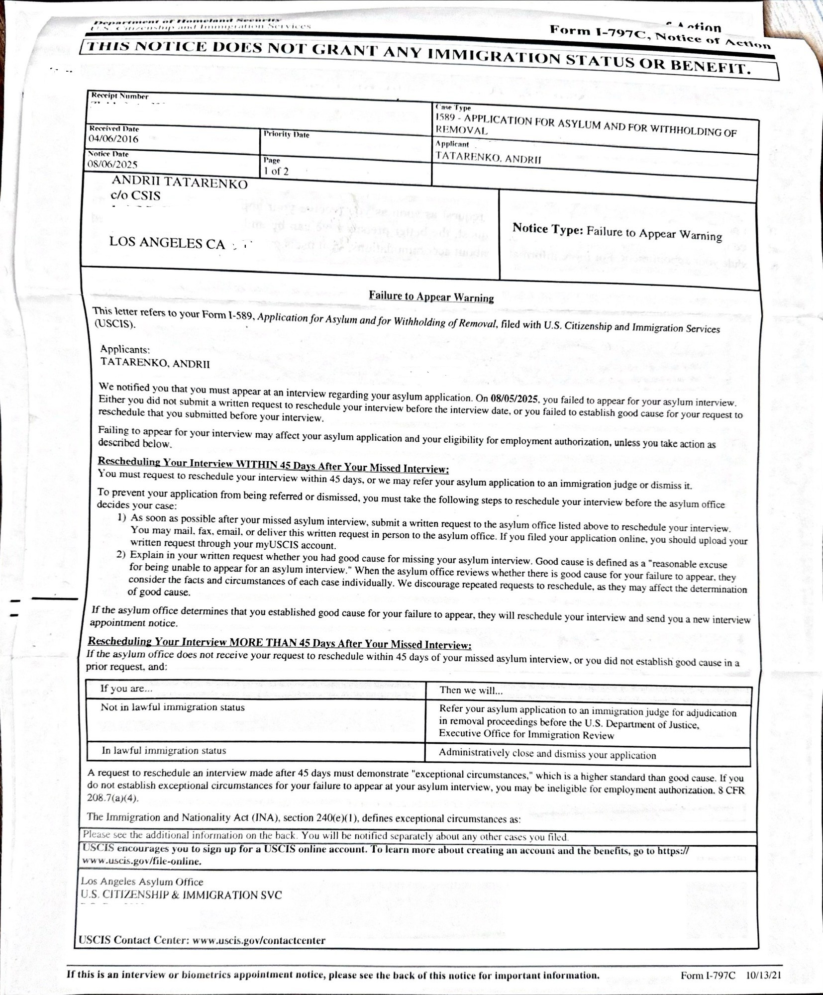 My interview ended up being rescheduled — but I was never notified by USCIS about the new date. Instead, they only notified me that I had missed it. I filed a request to reschedule, but now I am facing even more uncertainty and financial loss. The U.S. has become a dear home for me, and I would never want to miss the chance to continue building my life and pursuing happiness here.