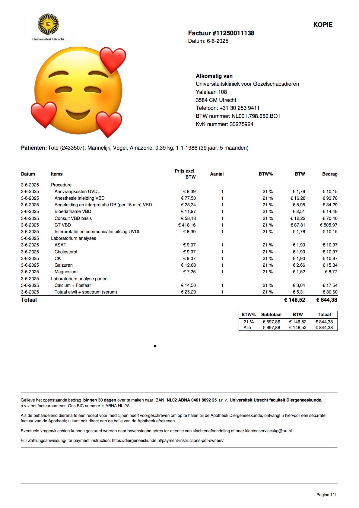 De rekening bedroeg uiteindelijk €844.