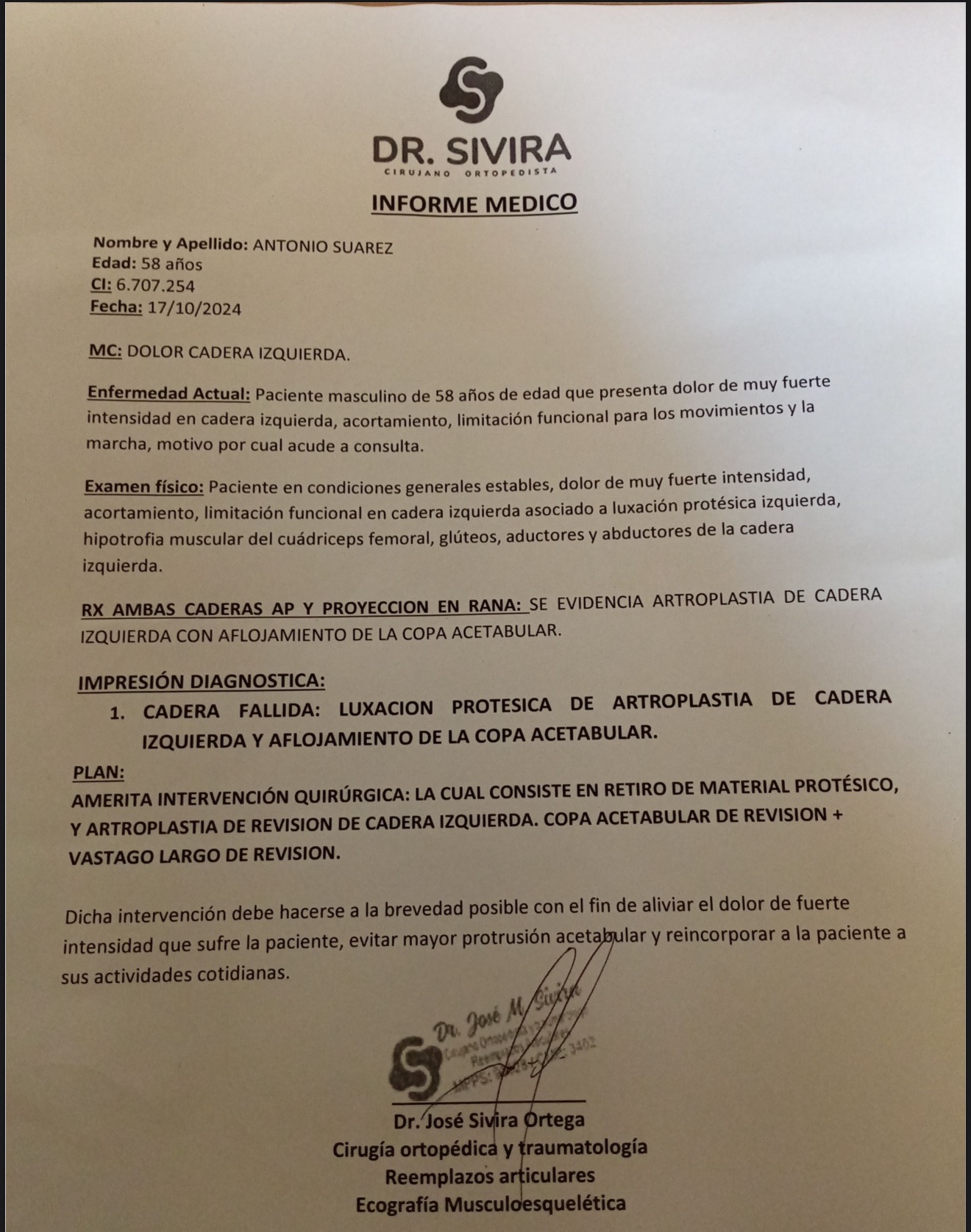 Hoy, después de otra operación reciente por osteomielitis, Antonio necesita una cirugía definitiva que le devuelva la movilidad: una artroplastia de rescisión de cadera con prótesis de revisión. El costo de la prótesis, la hospitalización y los gastos médicos asciende a unos 10.000 dólares, una cantidad imposible de cubrir para su familia.