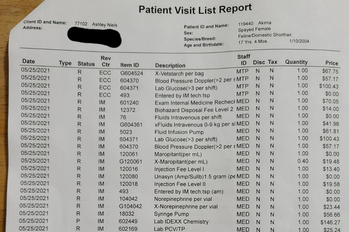 Akima has now been in the ICU for 6 days on 2 different antibiotics, fluids, pain meds, nausea medication, blood pressure medication and glucose. She seemed to be improving the first few days but has hit a plateau and she hasn't eaten at all, even when Ashley tried to coax her. Today, Friday, Akima was placed on a feeding tube and has spiked a small fever. The vet is still cautiously optimistic for a full recovery but Ashley is out of funds, never having imagined Akima would have to be in the ICU for so long.