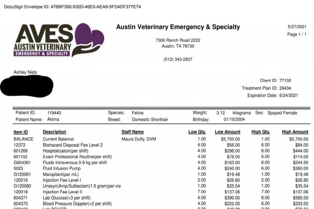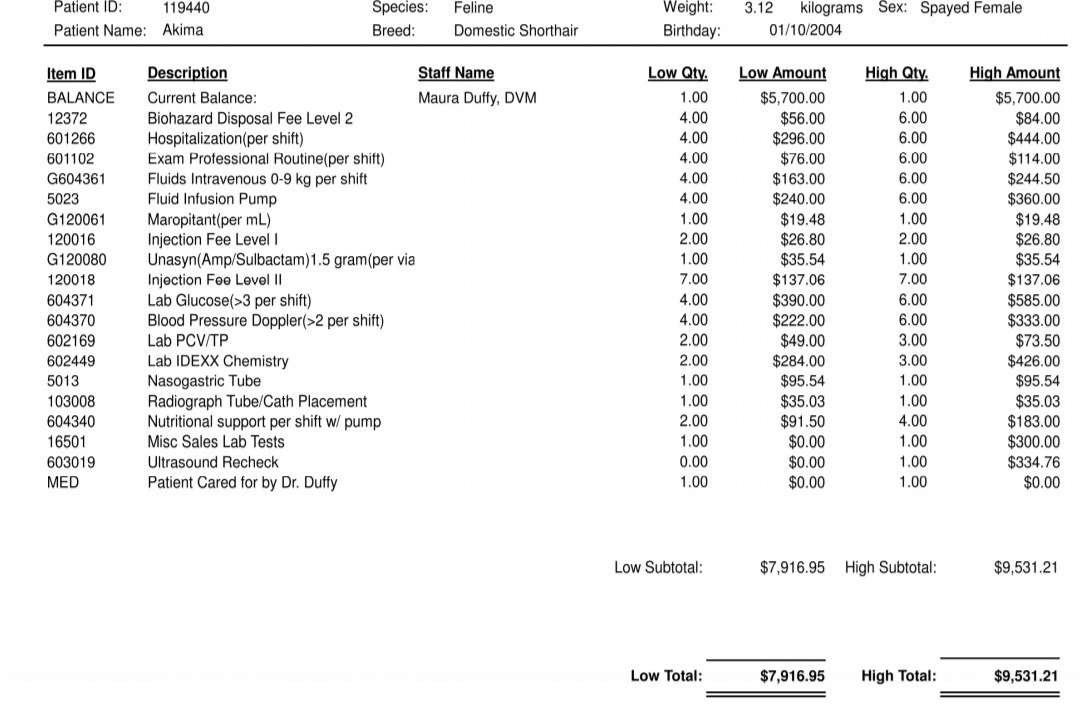 The vet would like to keep Akima on the feeding tube for a couple days to build up her strength, and is also awaiting the results of the bacterial culture to pinpoint the best antibiotic to fight her infection. Unfortunately, the medical bills so far have already maxed out Ashley's credit resources. As of yesterday, Ashley has already spent $5900 in required deposits toward a bill estimated to be at least $7900 but likely upwards of $9500.