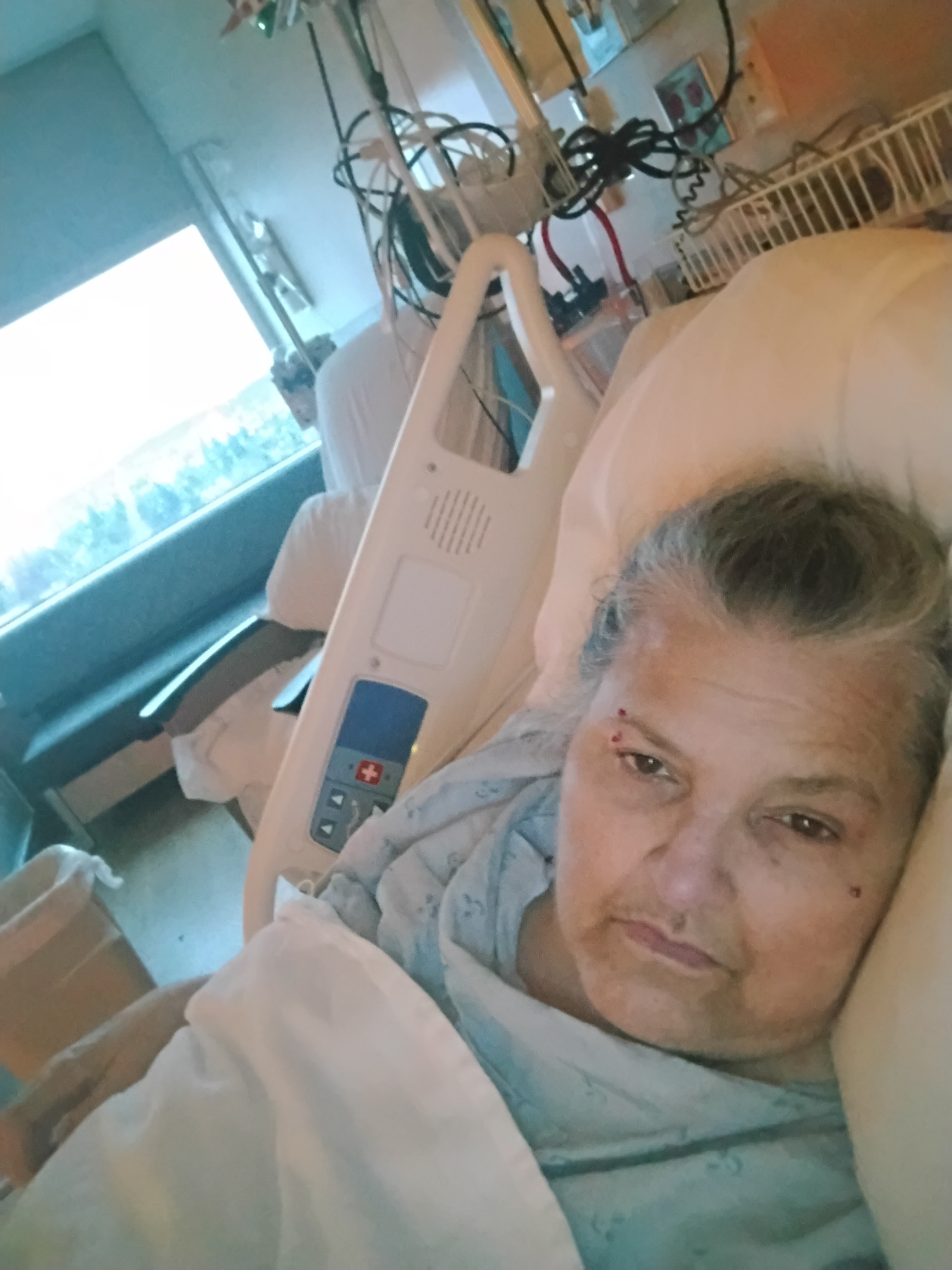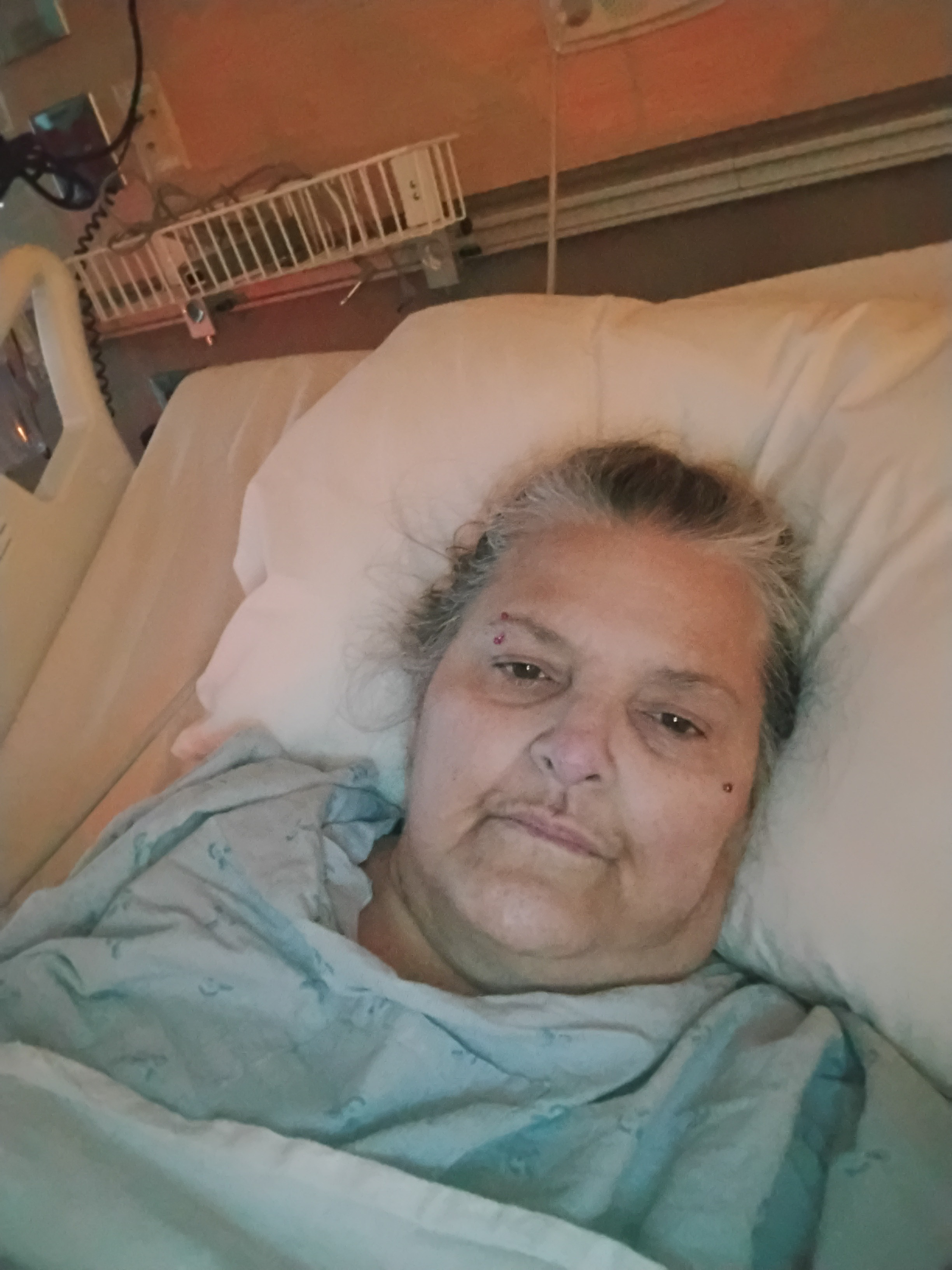 I'm Audrey, and I ended up in the hospital for a week because of cellulitis on my legs. Then, once I was better, I was home barely 4 days, and I had to go back in the middle of the night to have emergency surgery on an umbilical hernia. After a week in the hospital again, I went home and wasn't even there 24 hours before I had to go back because of complications from the surgery. So, all better and after a 5-day stay, I'm heading home in the morning.