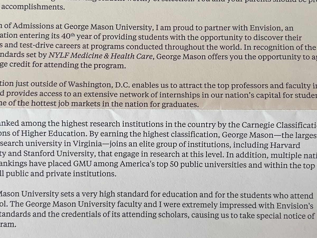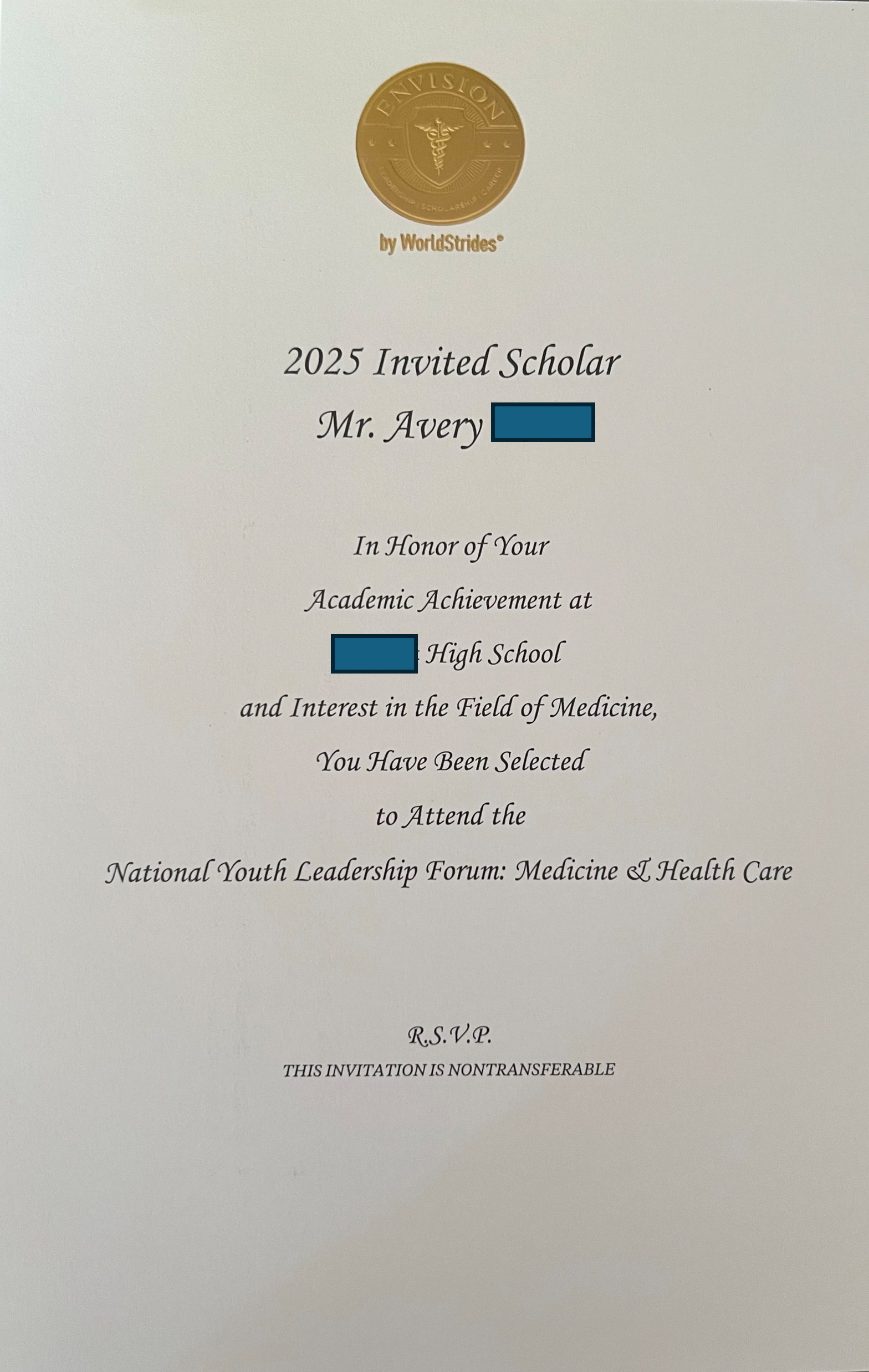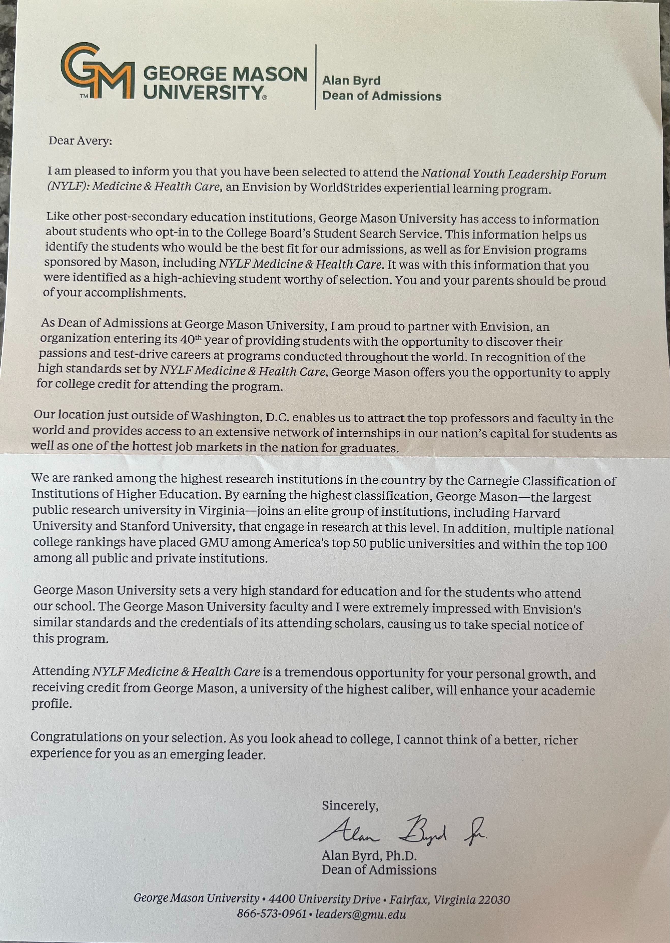 Our son, Avery, has been honored with an invitation from Alan Byrd, the Dean of Admissions at George Mason University, to participate in the National Youth Leadership Forum (NYLF): Medicine & Health Care, a week-long experiential learning program by Envision by WorldStrides in the summer of 2025 (NYLFmed.com). This recognition highlights Avery's status as a high-achieving high school student, and attending NYLF presents a remarkable opportunity for his personal development and the possibility of earning college credits.