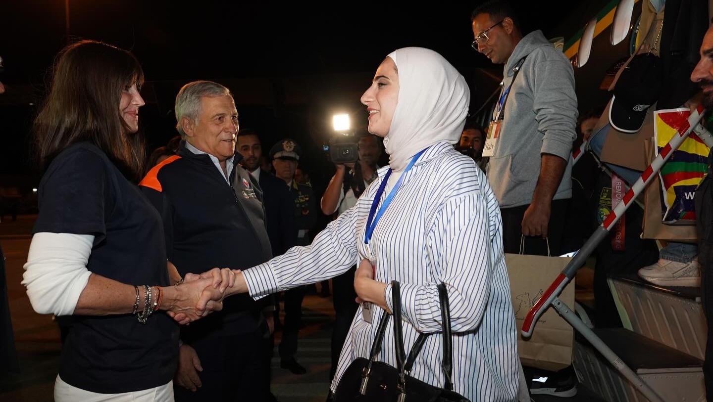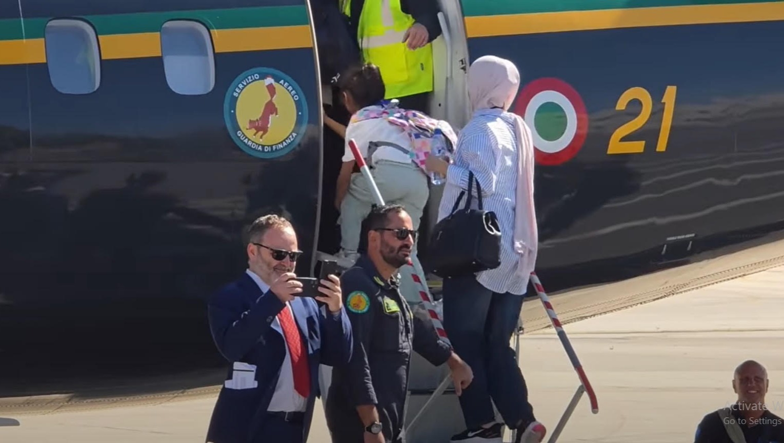 Stepping onto the Italian evacuation plane with her child in Amman, after enduring 36-48 hours of an extremely gruelling and very difficult