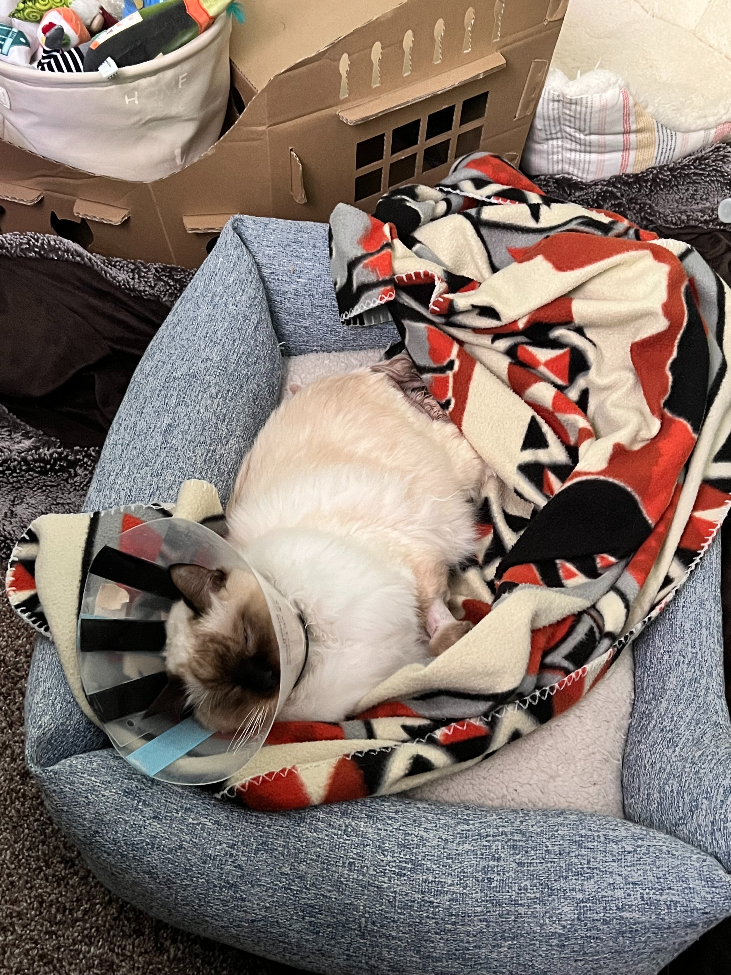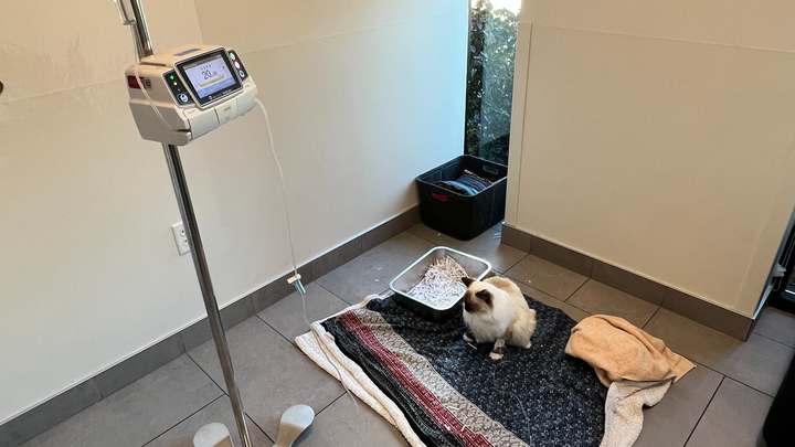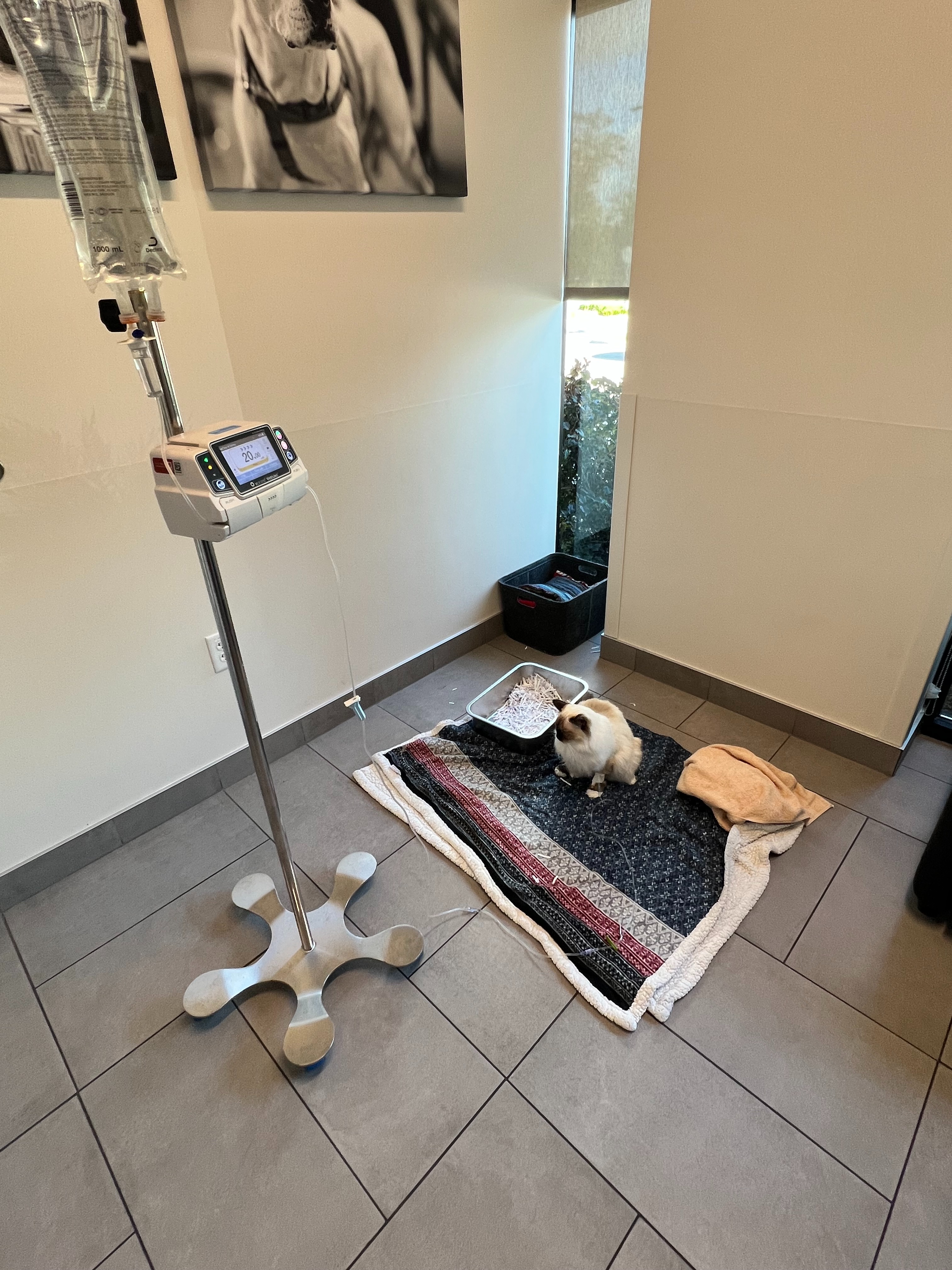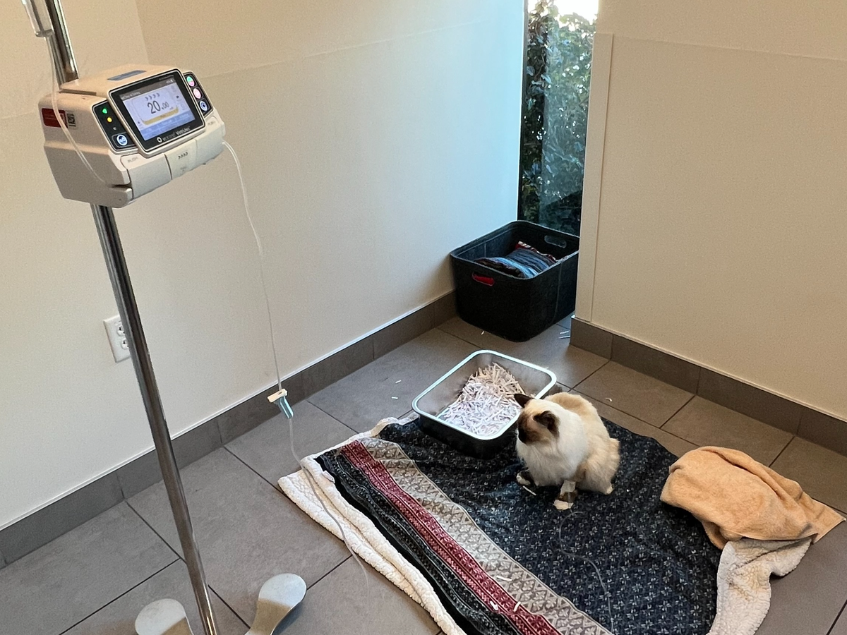 On August 21st, my boyfriend and I were in Iron Mountain, Michigan, having a small vacation with our cat Copernicus at his parents' river house. One morning, we noticed Cappy straining to go to the bathroom and decided we needed to go to the vet. We called all the vets up there, and one turned us away due to us not being from the township. The next vet said they don't take emergencies, so they told us to call the next vet. It became a cycle of no's, leading us 3 hours away. We come from the north suburbs of Chicago, so we decided to leave immediately for the 5-hour drive. Before even reaching home, we stopped at the veterinary emergency group that is close to our house. Unfortunately, he had a urinary blockage and had to stay at the vet for a few days; those nights and the unblocking cost over $6000, which I had at the time. While he was there, he blocked again and had to get another catheter. 48 hours later, on August 24th, we got our boy back home; however, the chances of recurring blocking are high after the first, and since he blocked a second time while at the vet, a third time was likely. We watched him like a hawk, and again, on August 25th, he started straining to pee and was blocked. We took him back to the emergency vet and decided the best chance for a good quality of life was a perineal urethrostomy instead of constantly getting a catheter. Surgery was early in the morning on August 26th, around 5 am, and another $4,000. We got a call after the procedure was over, telling us he did fantastic. We picked him up the same day after he was cleared for discharge. They told us everything we needed to do to ensure proper healing. I wanted nothing more than to nurse my boy back to health. I had charts for meds, notebooks to track when he went to the bathroom, ate food, etc. I slept on the floor with him, waking up almost every hour to check on him.