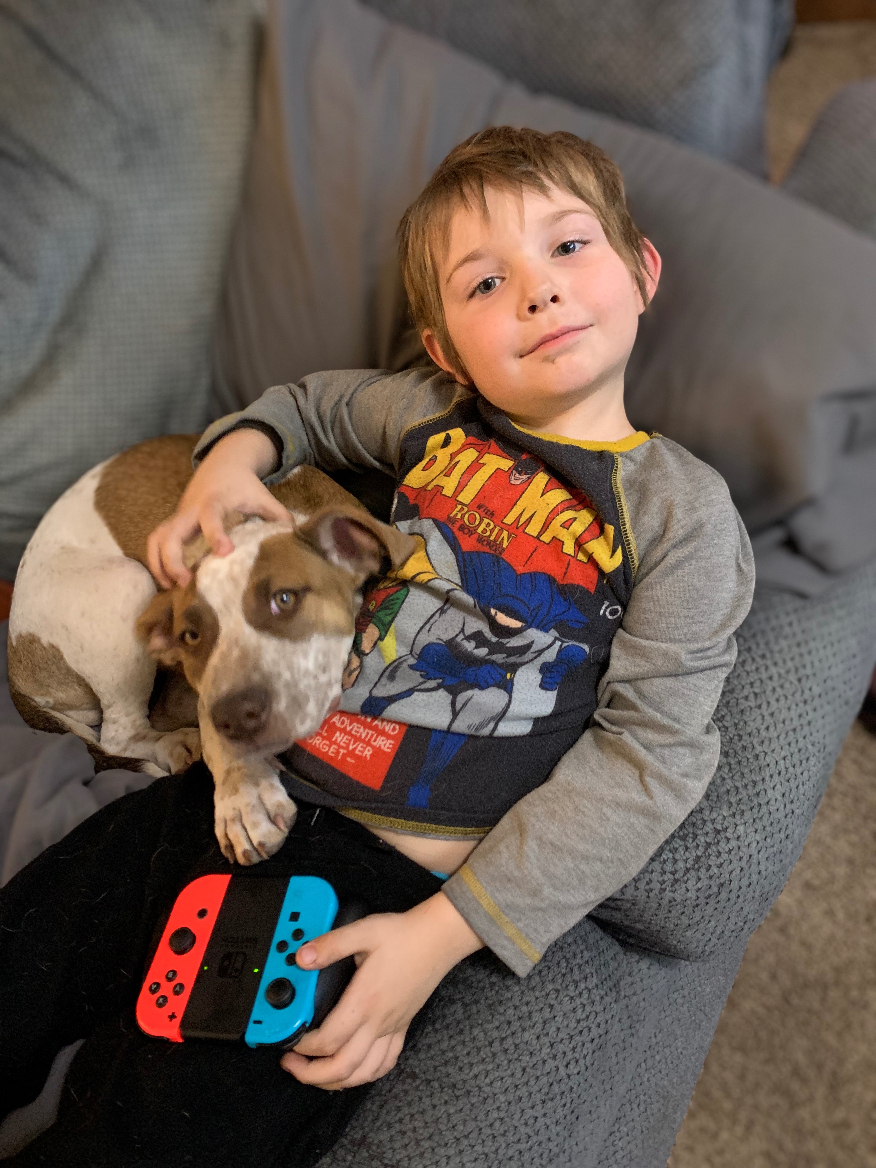 This is Bambi. Bambi is a pitbull mixed with… something. She has held my son’s heart since the day we brought her home, and when she turned four, our lives turned upside down. She’s always had a sensitive tummy (which I assumed was credited to her pit background), but a vet visit uncovered her stage 3 kidney disease. I decided to get allergy panels to try and best figure out how to support her and this poor girl is allergic to everything under the sun, aside from pork, potatoes, and, kangaroo. She stopped eating, stopped moving and both my son and I were devastated. I had to go through a week and a half of feeding and watering her via a syringe, another week of watching her slowly and sadly lap up a pork moosh, and now I home cook her meals each and every night. I’ve had to watch this poor girl go through a horrific weight loss and a tremendous amount of hair loss.