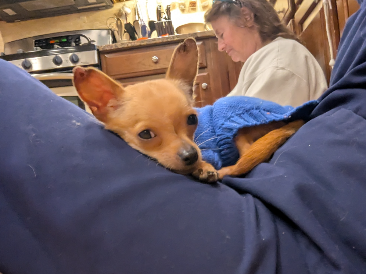 I'm rambunctious, playful, friendly, love to be held and absolutely have a Napoleon complex (typical chihuahua!). I've gained weight, now about 4 lbs, and am about 7-8 months old.