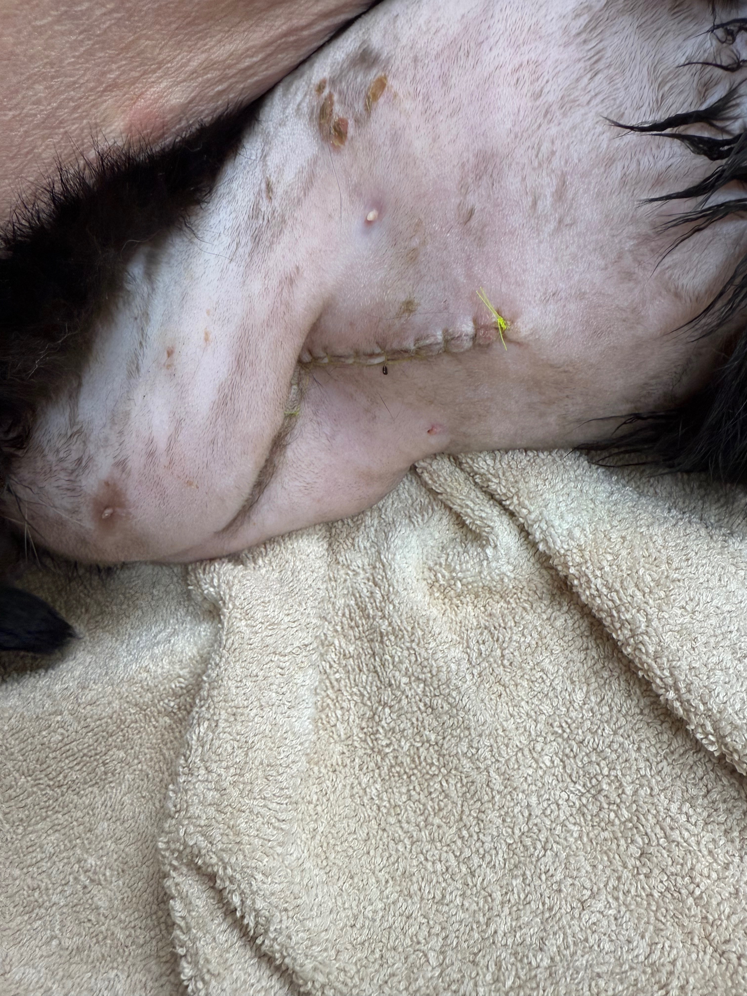 Her surgery went fairly well, but her intestine was very inflamed, and sutures were tricky to hold. The vet sent a piece of tissue to the lab for a biopsy, thinking she could have possible lymphoma. We are still waiting for those results.