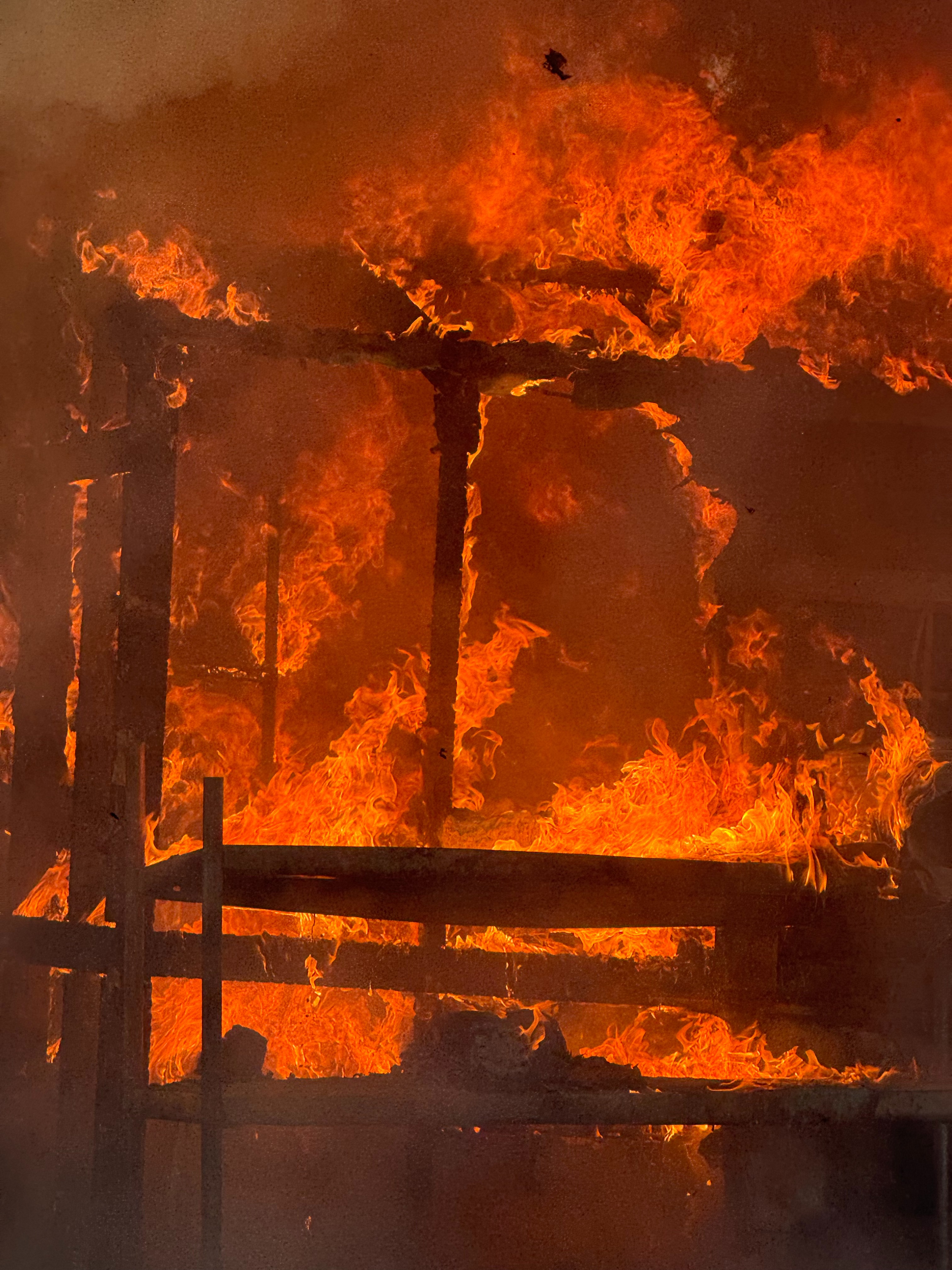 24' cooler engulfed. That cooler built a little over a year ago housed deep freezers, kitchen prep and stock, deli/front shop items, a bounty of produce, racks on racks.
