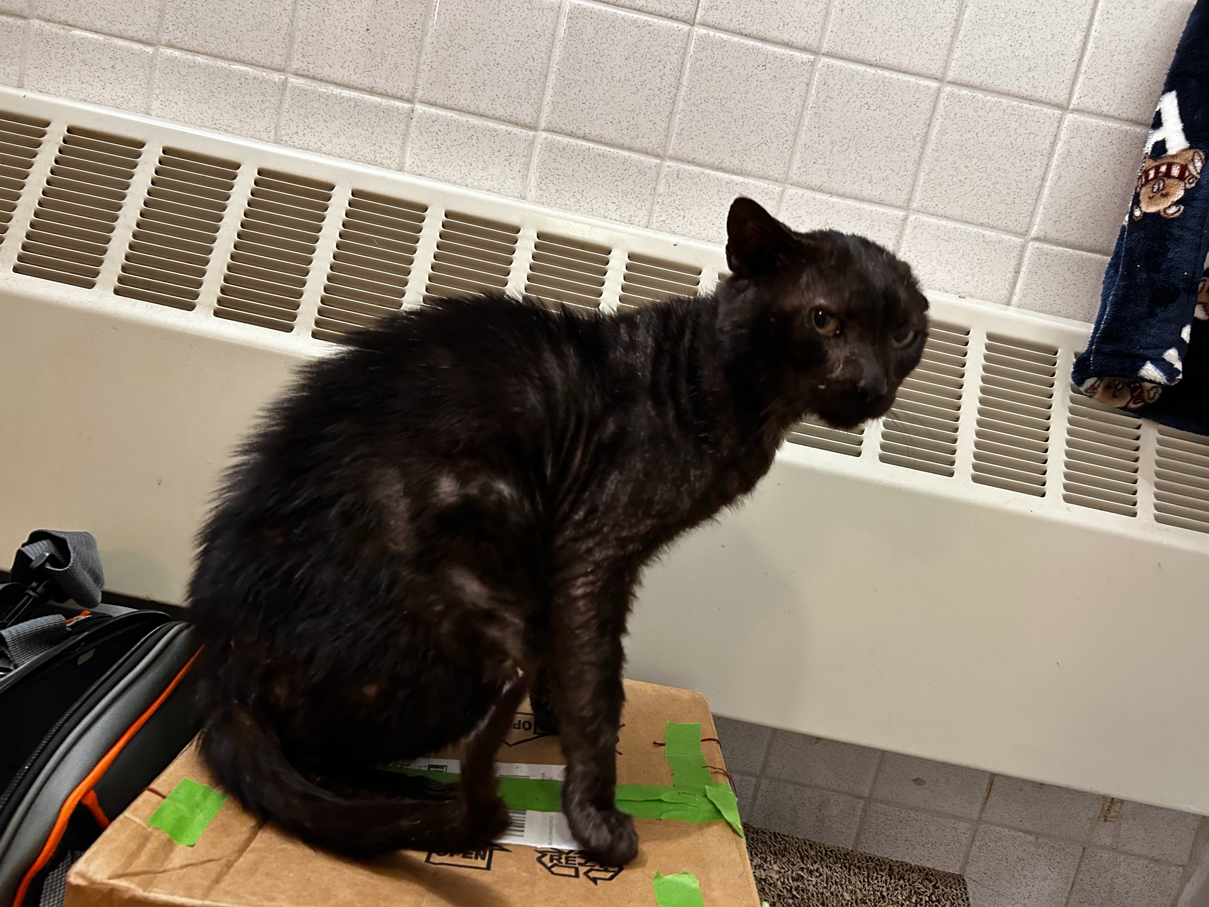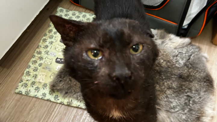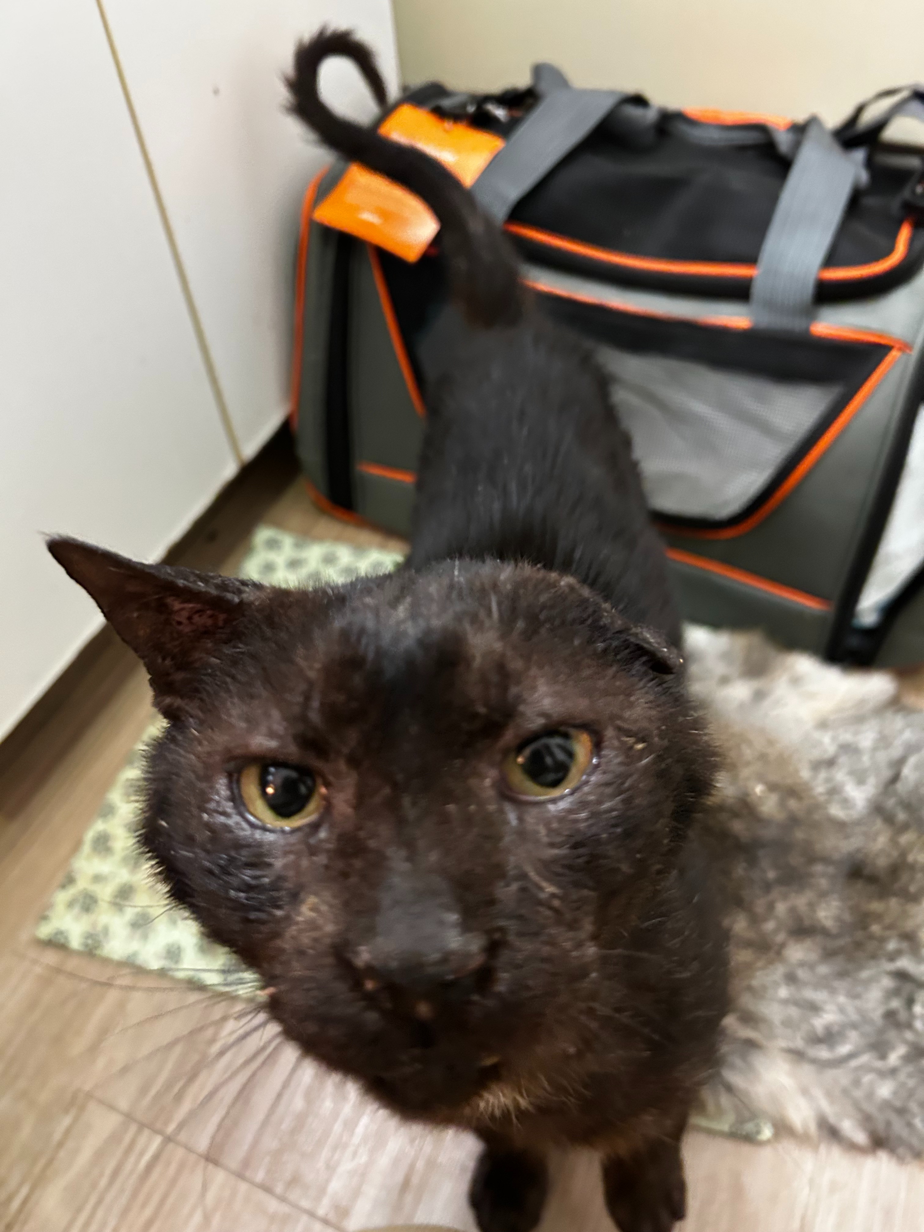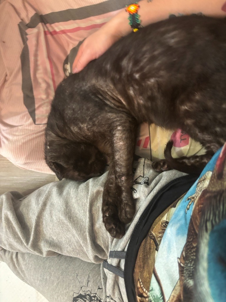 As someone who is such a huge lover of animals, I could not simply turn away from Benito when I found him meowing at patrons entering a little cafe near where I was staying in San Juan, Puerto Rico. It was clear that the kind people of the neighborhood tried their best to feed the many stray cats, but Benito's health had deteriorated so badly that I knew he needed immediate intervention. I made note of his hiding spots, got a carrier, made a vet appointment, and took him there the next day. He has not hissed, scratched, or bitten once, and he is always looking for cuddles. I have another kitty that I adopted from a rescue org in Florida, who was also a street kitty, and I wanted to pay it forward with Benito.