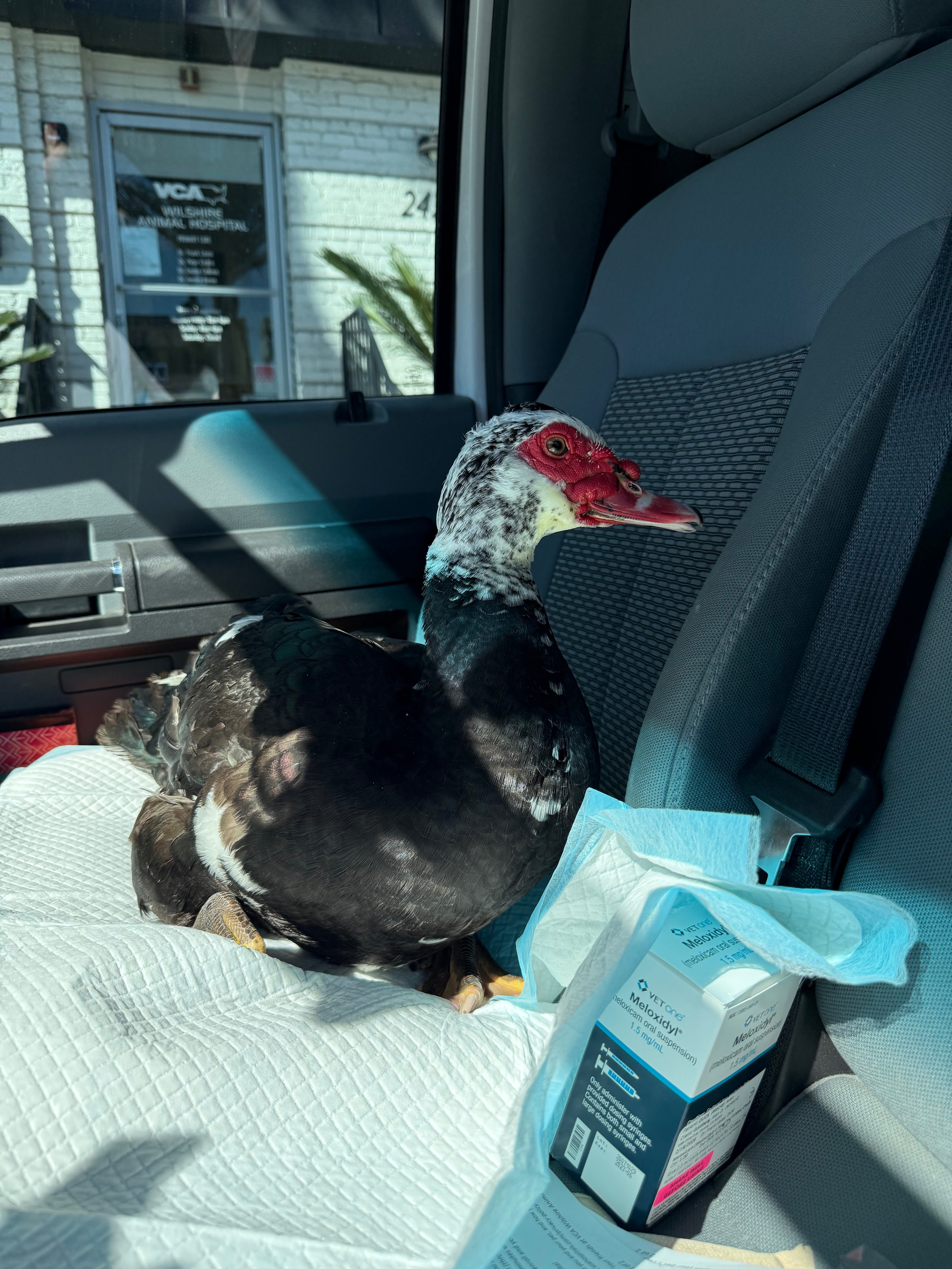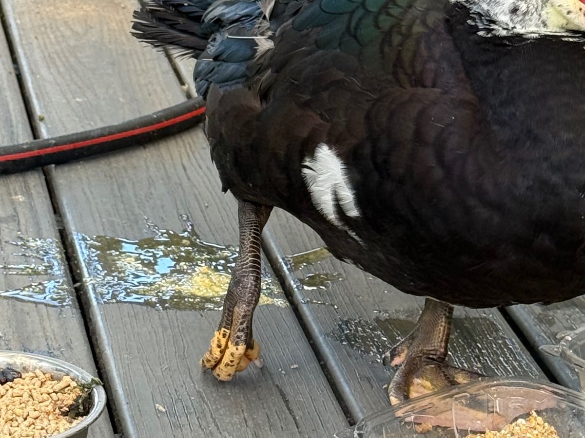 Several days ago, Billy suffered a serious leg injury that left him unable to walk. Because domestic Muscovy ducks can't fly far and Billy couldn't run to the water for safety, he was left vulnerable to predators like raccoons and coyotes. Fearing for his life, the ladies reached out to me for help. When I took Billy in, it became clear that his injury was severe and required immediate veterinarian care.