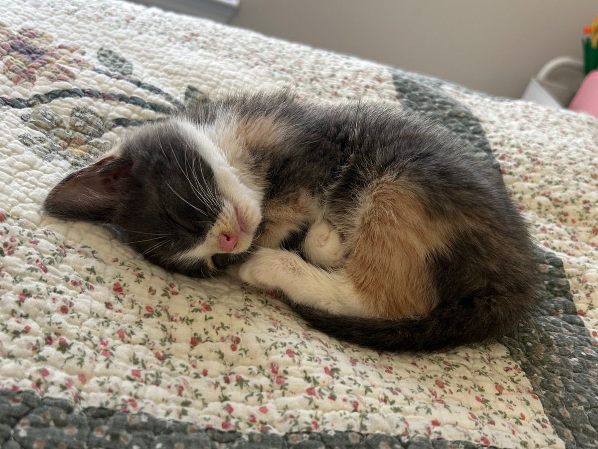 Blossom is a six-week-old diluted calico kitten who has already faced more challenges than most pets do in a lifetime. I adopted Blossom on June 17th, 2025, after she appeared on my Grandma’s doorstep—skinny, dehydrated, and struggling to survive the summer heat. From the moment I met her, I knew I wanted to give her a safe and loving home.