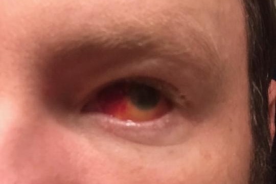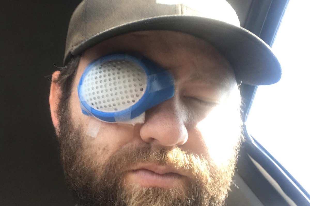 He was unloading wood from the back of the truck and dropping the wood on the wood pile next to the fire when a branch/twig must have snapped off as it hit the ground and flew back up and hit him in his left eye. Causing a full globe rupture and a total retinal detachment of that eye.