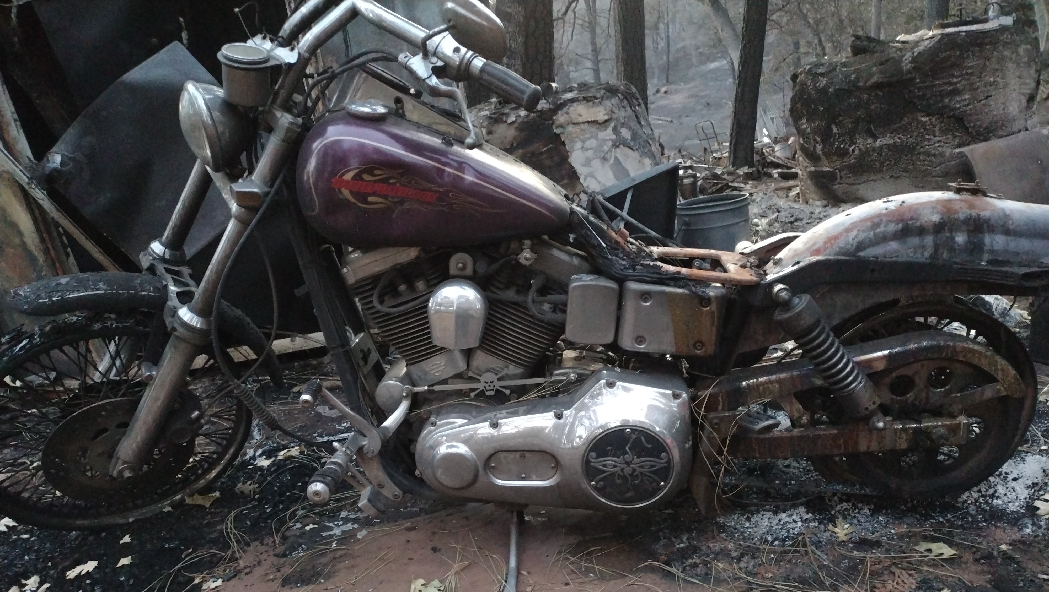 My name is Brian Bowles and I've lost everything I had to the Park Fire. House, tools, collectibles, and irreplaceable inherited family items that were priceless to me. I have what's left of my Harley Davidson Dyna Wide Glide. It is what I can get running for transportation with some help from you. I did manage to grab my leathers and helmet for riding. Everything else burnt completely that was in and outside the house. With just a few hundred more dollars I can get tires on it so I can move it. It still sits where it burned. I'm very worried that if I don't move it soon one of the burnt trees are going to fall on it. Please don't let that happen.