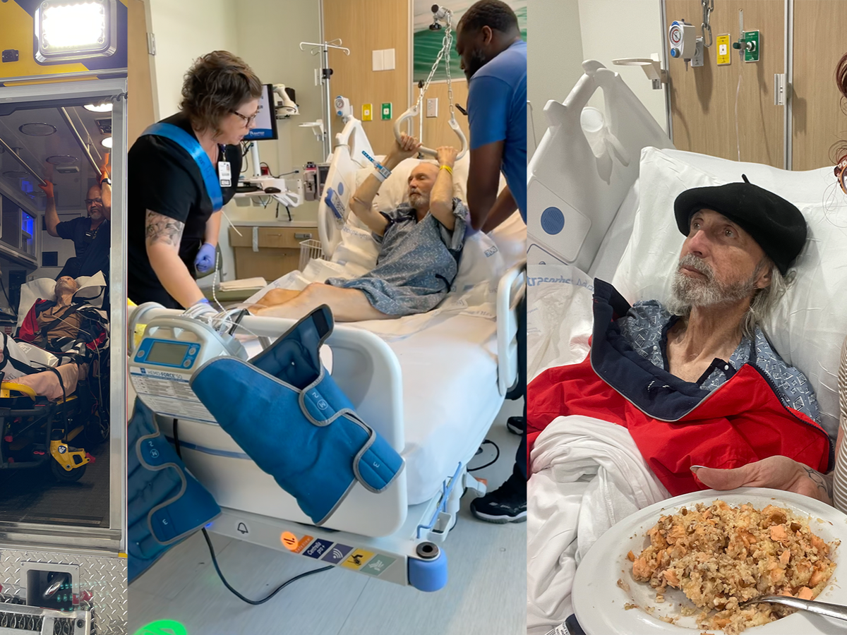 We're stuck in Florida now. Taryn has been sleeping in the hospital every night to help the nurses because Dad has special needs that make him different from typical patients. He gets confused, sometimes agitated, and needs someone familiar to keep him calm. The hospital staff have been great, but they're stretched thin, and Dad needs that extra attention.