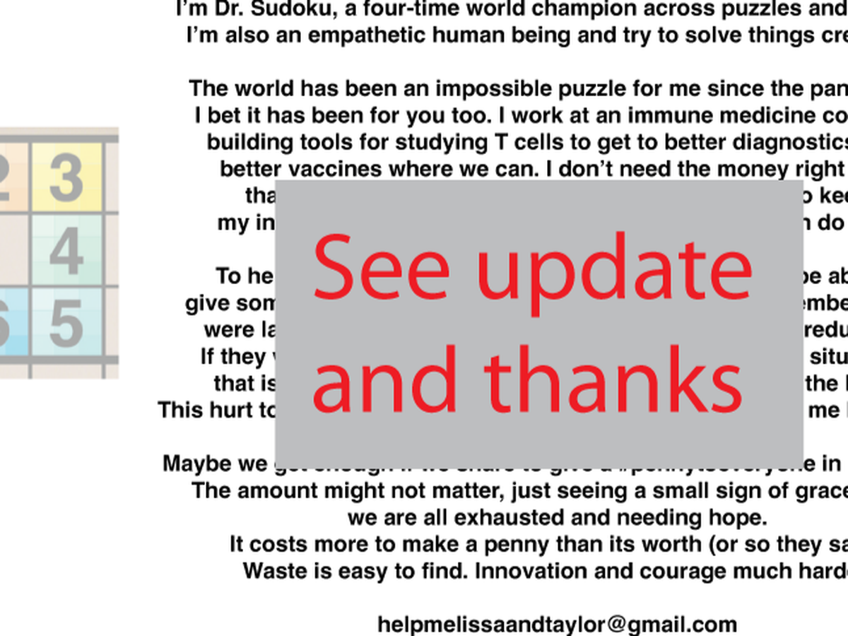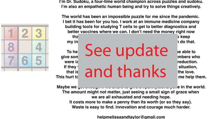 The world has been an impossible puzzle for me since the pandemic. I bet it has been for you too. When this gofundme was started in 2022, I worked at an immune medicine company building tools for studying T cells to get to better diagnostics and better vaccines where we can. I don’t need the money right now that my prior ideas has given me in my past. I need to keep my innovative team innovating and this is one way I can do that.