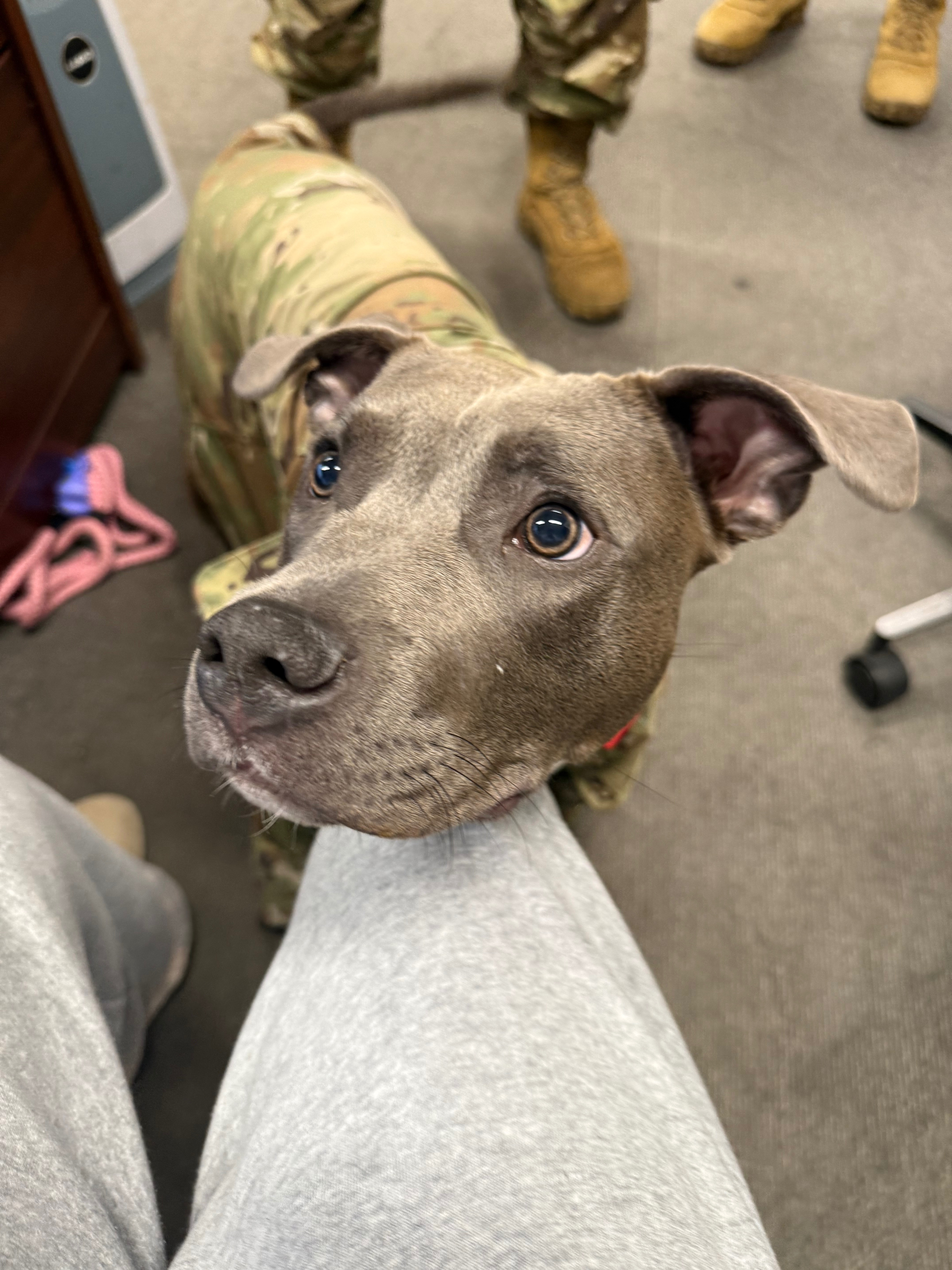 My name is Abbigail, and I’m currently serving in the military, preparing for a major move from Japan to Italy. My 9-month-old Staffordshire Bull Terrier, Uva, has been my constant companion since she was just 8 weeks old. We do everything together—she comes to work with me, visits friends, and is always by my side at home. Over the past six months, Uva has helped me through some of the toughest times, providing comfort and love when I’ve felt most alone. Military life means constantly saying goodbye to friends and being far from family, but Uva has been my anchor, making every day brighter and more bearable.