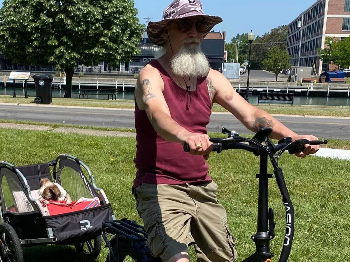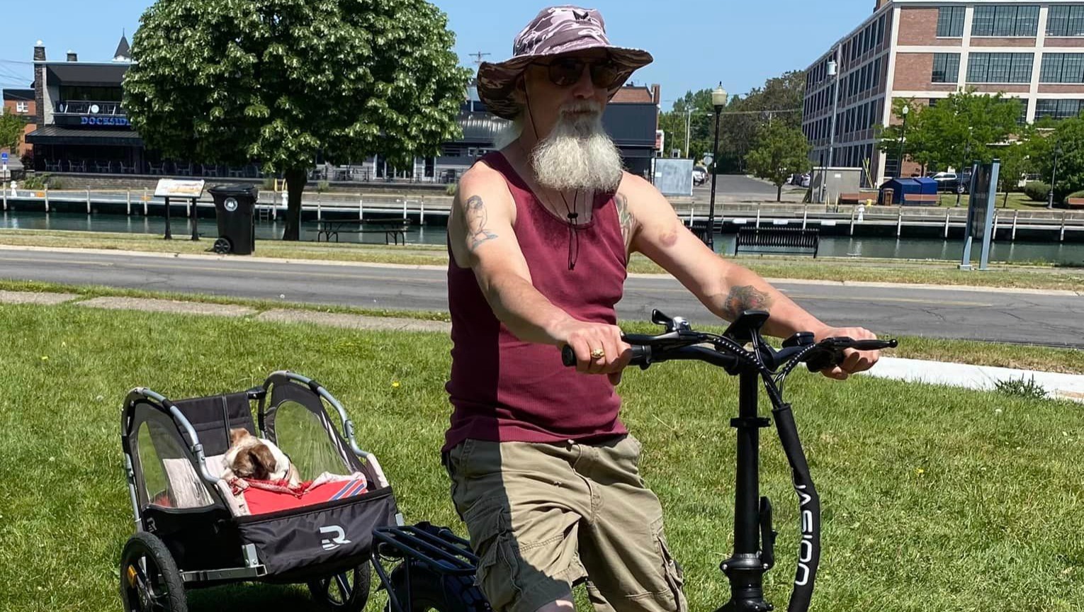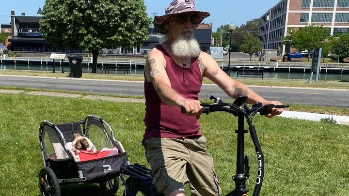 I was so disheartened to learn that my neighbor’s bike and carriage were stolen from his property in the City of Tonawanda, NY sometime between the evening of Tuesday 9/19/2023 and the morning of Wednesday 9/20/2023. These two best friends, Bruce and “Jacob-Gizmo” have walked many many miles over the years along the Erie Canal and the Niagara River in the City of Tonawanda and the Town of North Tonawanda, exploring and visiting with everyone they pass along the way. They have been a fixture in this area for years. Maybe you've seen them or talked to them yourself. Bruce is always good for a chat with his neighbors, telling stories and sharing his love for his little buddy.