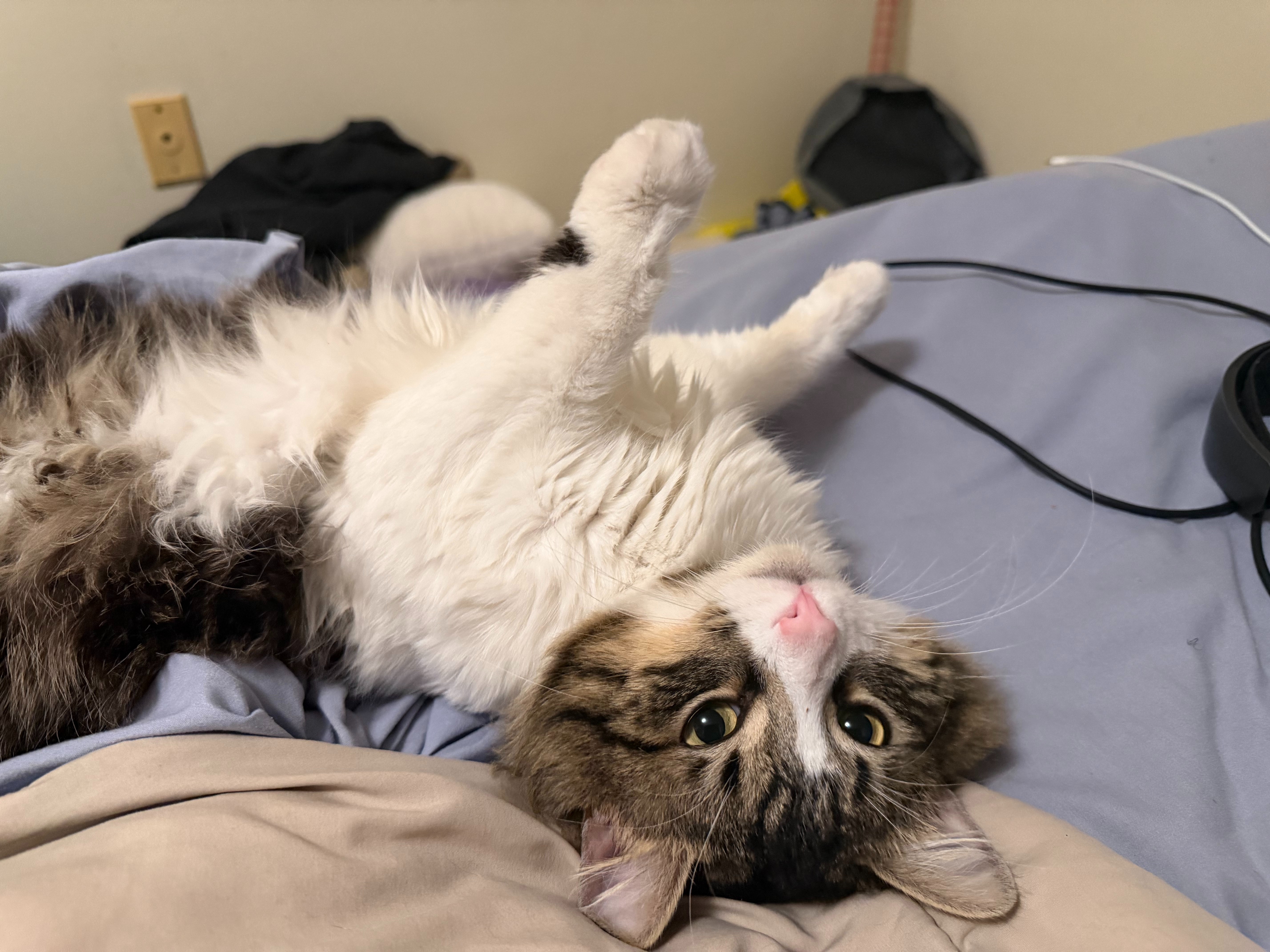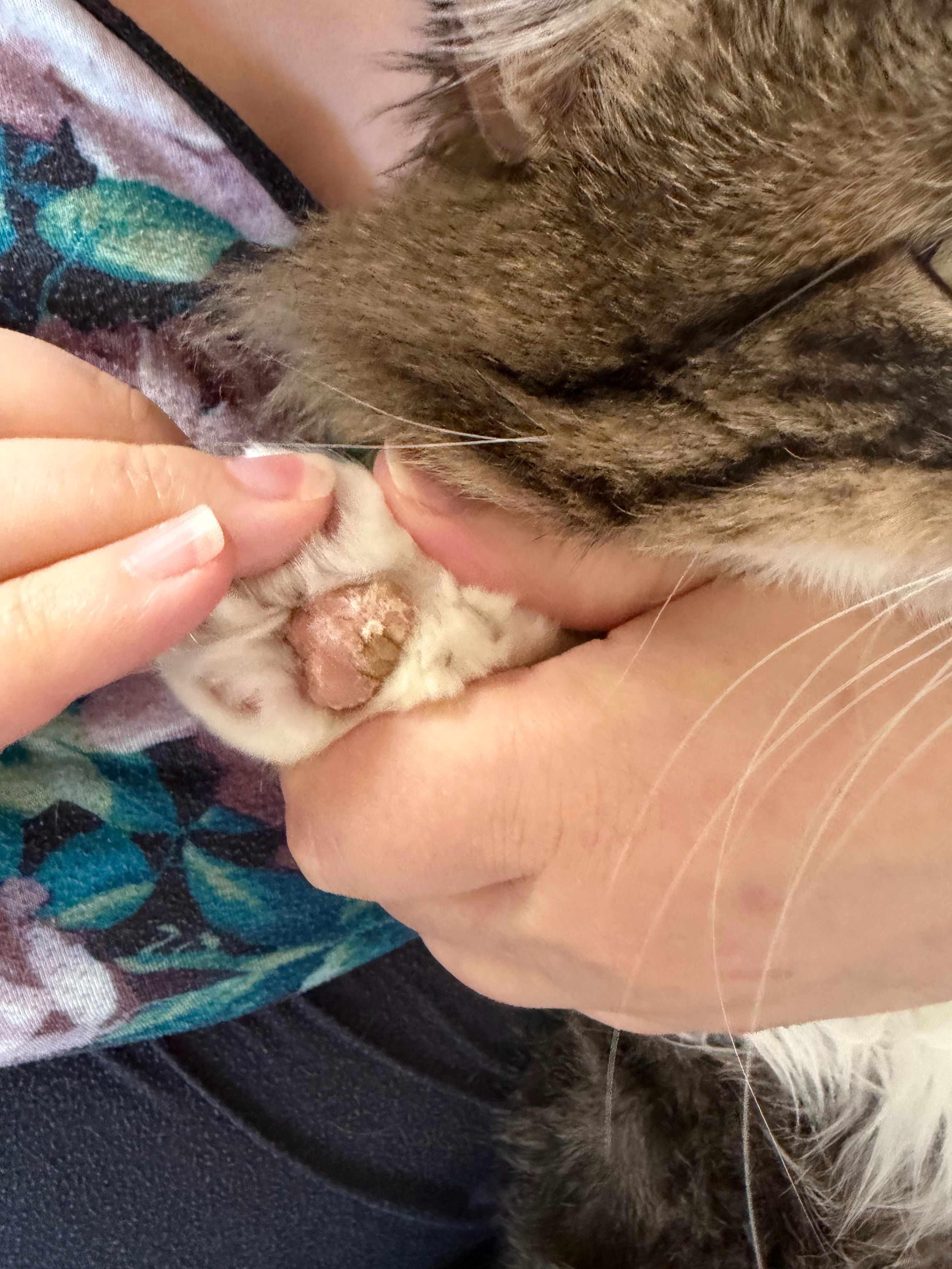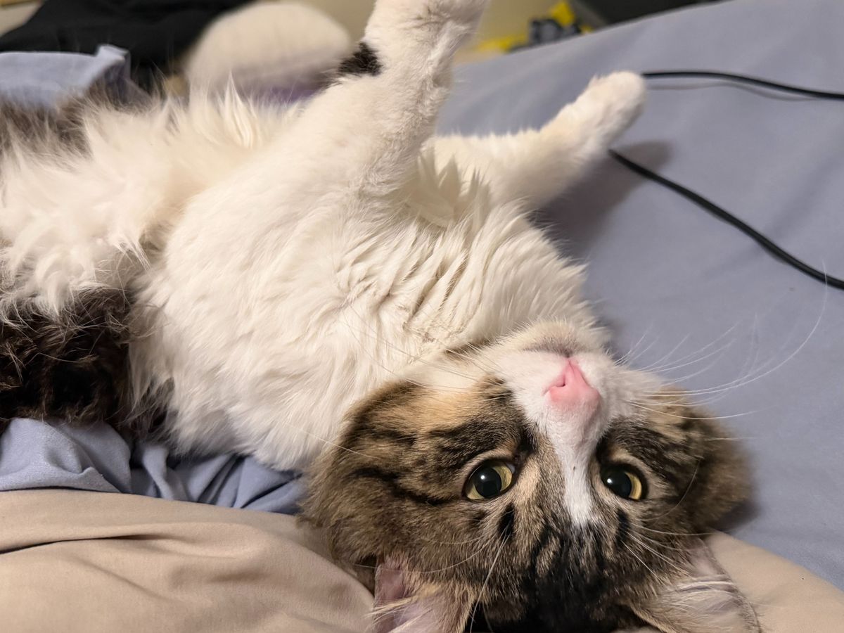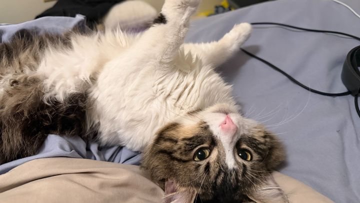 I found Bugsy outside during a harsh winter storm, shivering and alone. His right paw is permanently stuck, and he can't use his claw at all. I do my best to care for him, frequently applying Vaseline to his paw because it looks like he was attacked by another cat and suffered mild frostbite. Despite everything he's been through, Bugsy is incredibly sweet and has quickly become a beloved part of my life.