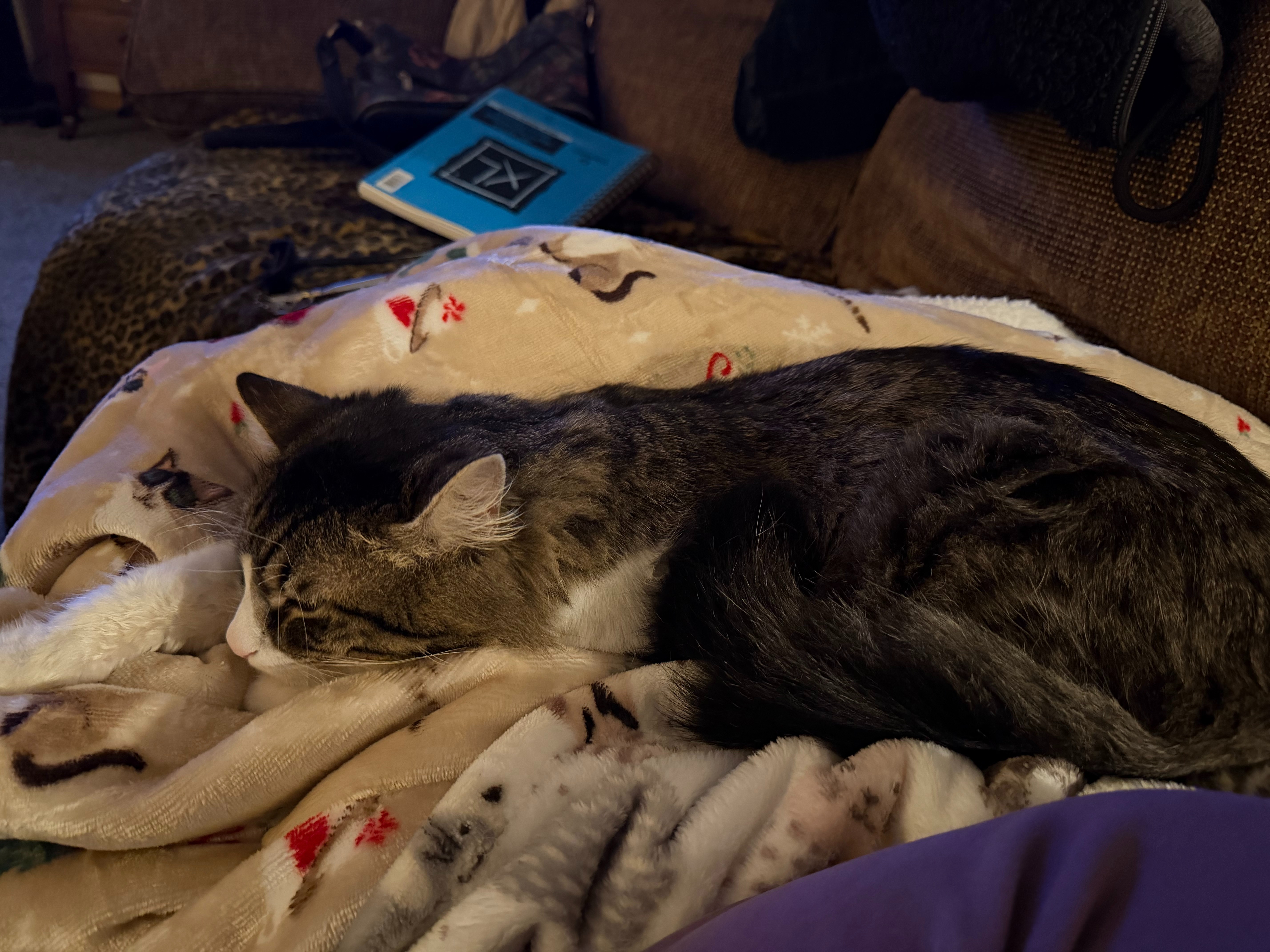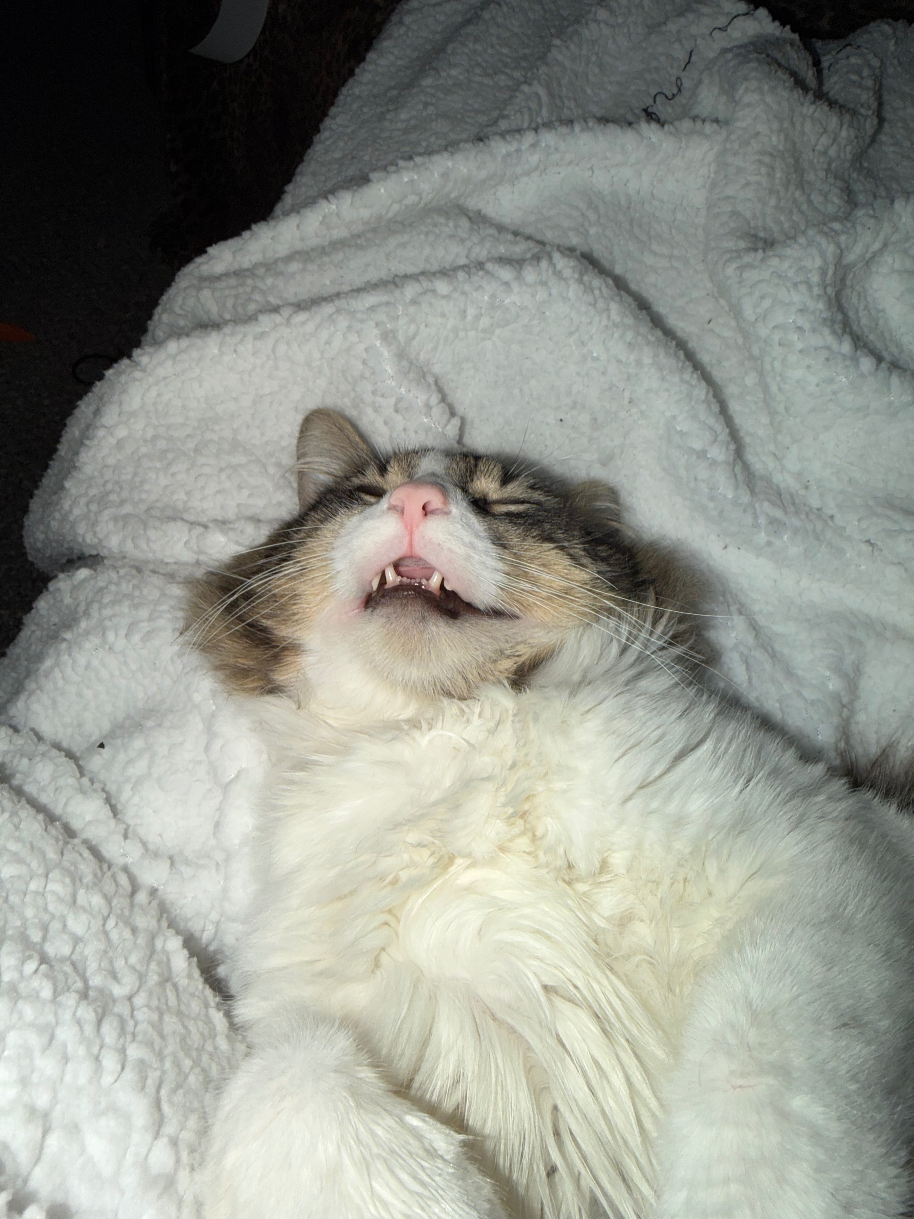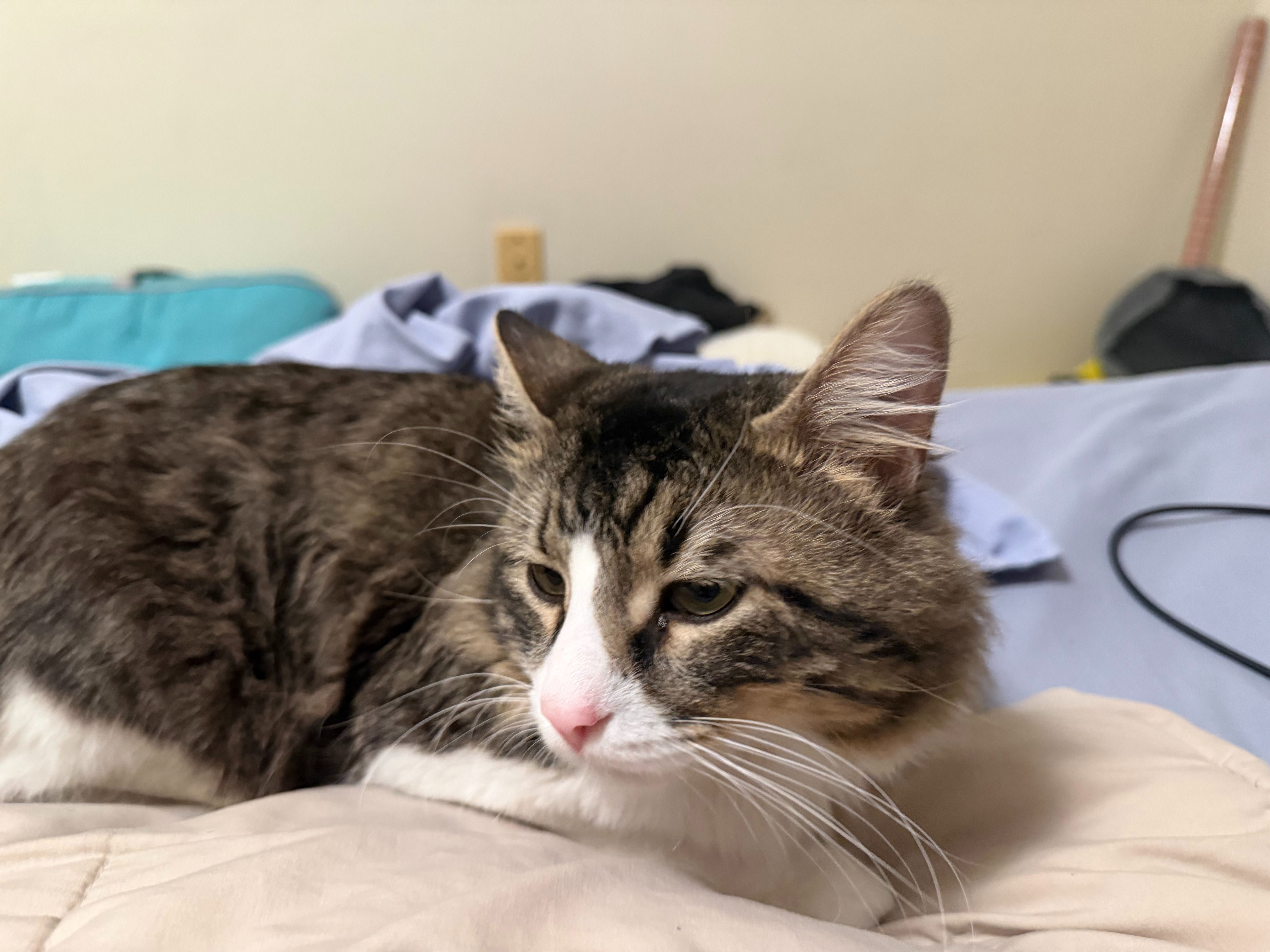 I found Bugsy outside during a harsh winter storm, shivering and alone. His right paw is permanently stuck, and he can't use his claw at all. I do my best to care for him, frequently applying Vaseline to his paw because it looks like he was attacked by another cat and suffered mild frostbite. Despite everything he's been through, Bugsy is incredibly sweet and has quickly become a beloved part of my life.