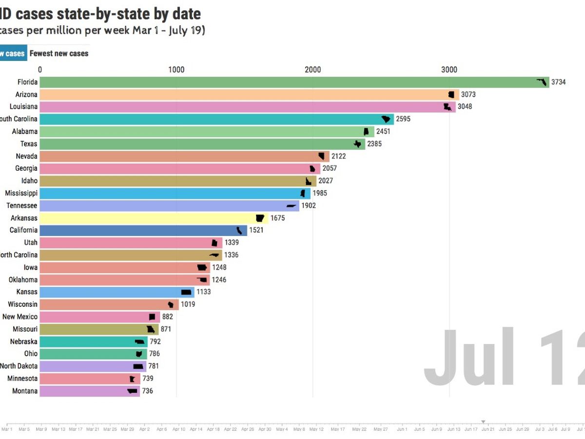 In July 2020, I made a nifty COVID animation chart that really took off, getting almost a half million views in a week, taking down my server for a bit.  Since then, I made a half dozen more charts, the total-cases-by-partisanship really blowing up, getting tens of millions of views (and taking down my server again).  My server can now handle that much traffic, and I spend about an hour a day keeping the charts up-to-date.