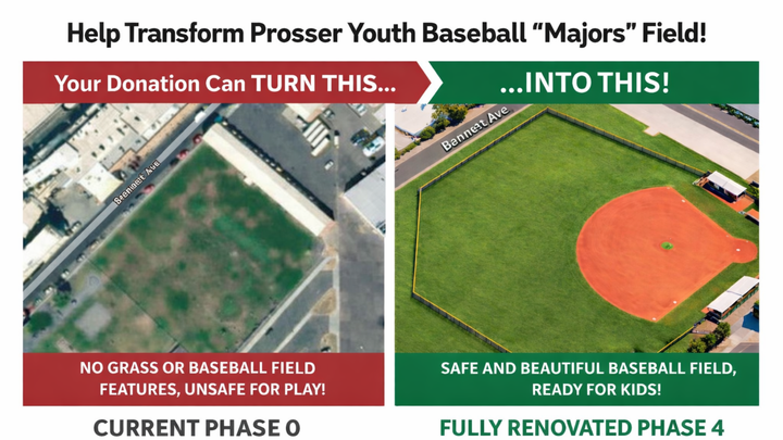 Prosser Youth Baseball has been a cornerstone for young athletes in our growing community. As more families move to Prosser, the interest in youth baseball has soared, but unfortunately, our options for practice and games remain limited. Our kids deserve a dedicated space where they can learn, play, and grow through the sport they love. That’s why we’re raising funds to build a new baseball field—one that will serve as a safe and welcoming home for current and future generations of players.