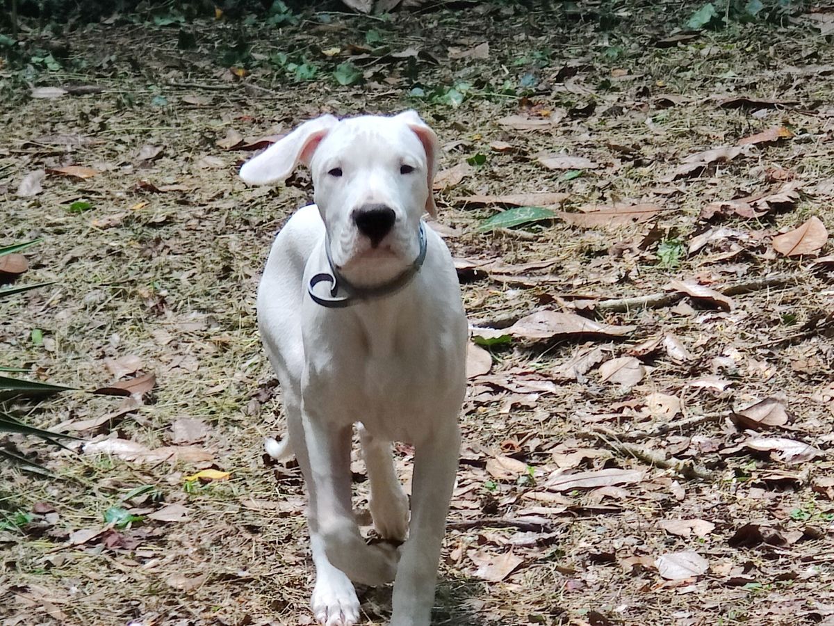 Caddy is a Dogo Argentino, this is a very large working breed dog known for the potential of animal aggression due to their lineage as boar hunters. Caddy has shown no aggression to anything but peanut butter and is a very quick study.