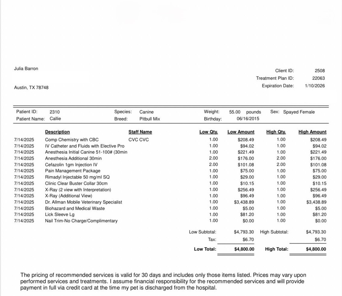 I have added her surgery estimate ($4,800) to the photo collection on this page if you would like to see specifics of the cost breakdown. Please consider donating any amount to help cover Callie's medical expenses. 100% of the donations go to help offset the costs of the surgery, relevant vet visits, and the lengthy physical therapy for her healing and recovery. If donating is not realistic for you, I would love and appreciate if you could share this fundraiser to friends, families, coworkers, etc. Any action or amount helps. Thank you for reading, and thank you so much for your support. I will make sure to include updates and pictures of Callie throughout her treatment journey. If you were with Callie right now, she would no doubt be ruthlessly licking your face with love and gratitude. Thanks, y'all <3