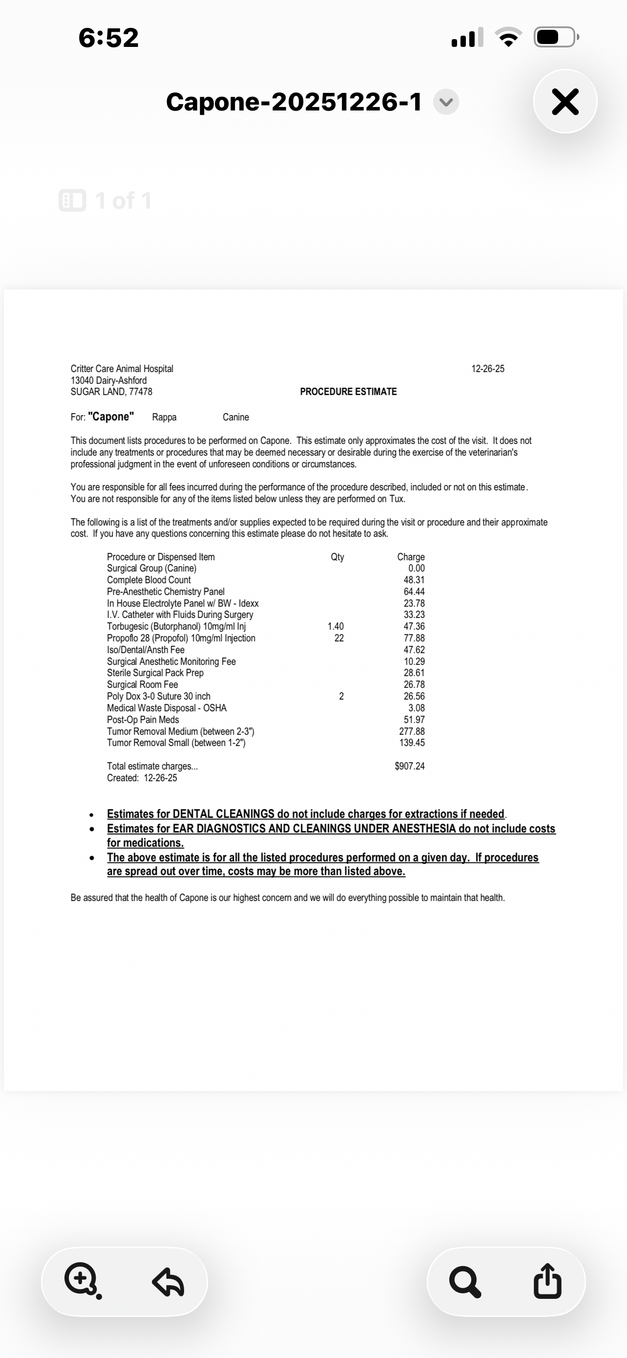 To be as transparent as possible, I’ve included the veterinary estimate, photos of Capone, and the clinic’s information below so you can see exactly what the donations would be used for.