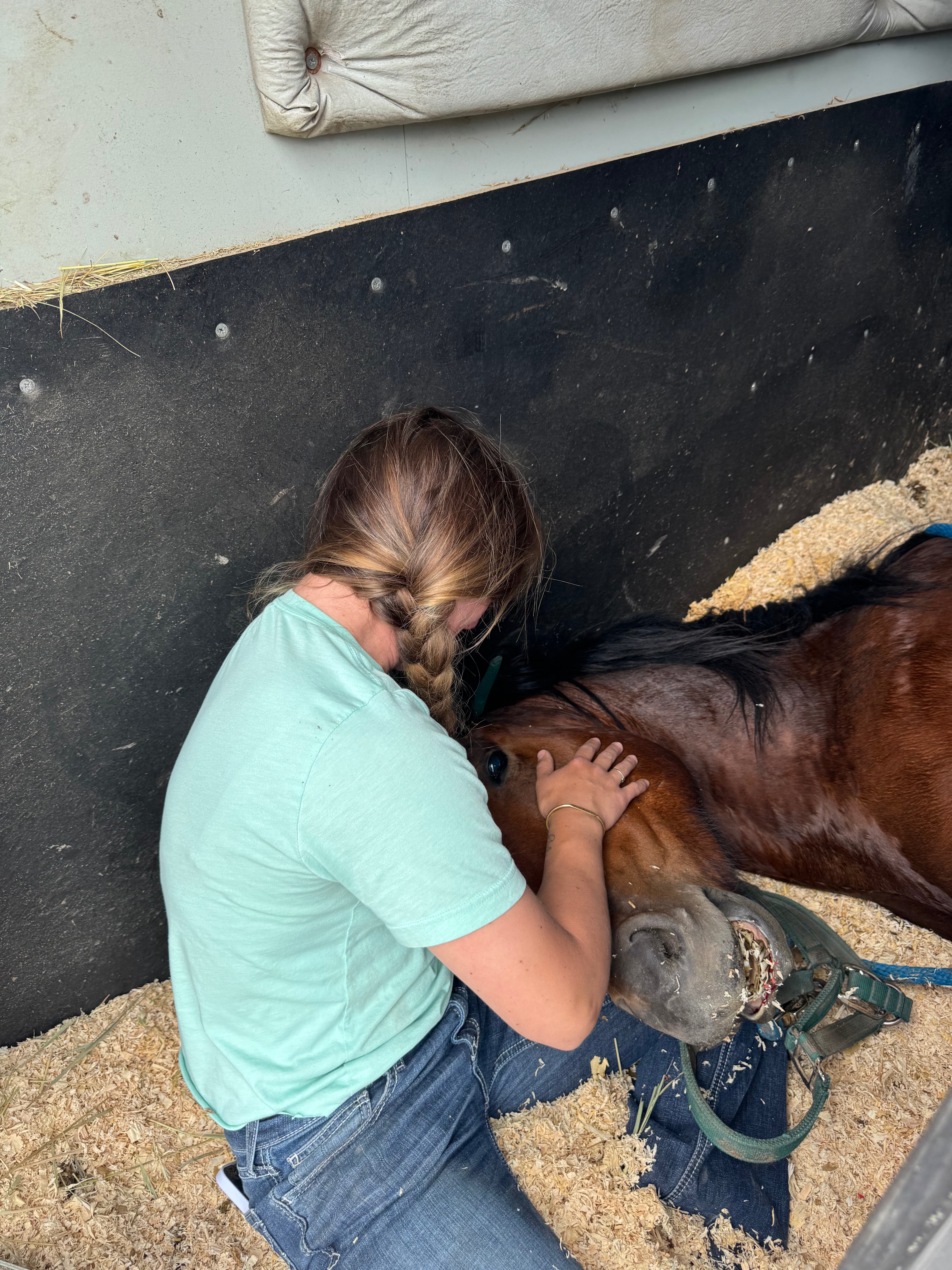 I’ve never seen Champ kick, but he is a horse and you never know. I told the owner to give me one day to find Champ a new home. I came out to take Champ the very next morning and found him laying in the dirt covered in sweat with a broken shoulder and no chance to recover. My strong boy, I got him standing and in the trailer while all he wanted to do was lie down, already on his way out. The vet told me he broke his humerus by his shoulder from blunt force impact. I held his head and cried and prayed over him until he left this Earth, too soon and with too many questions in my heart. How it happened will probably never be learned.
