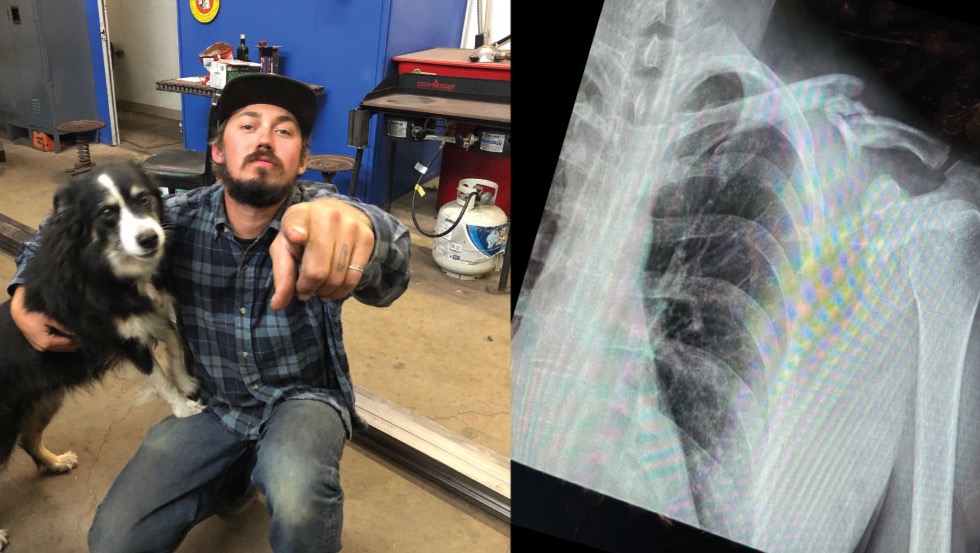 A car veered into Casey while he was riding his motorcycle. He was pushed into a curb and thrown off his bike into oncoming traffic. Luckily, cars were able to stop and avoid him. During the crash he broke his collarbone in three places.