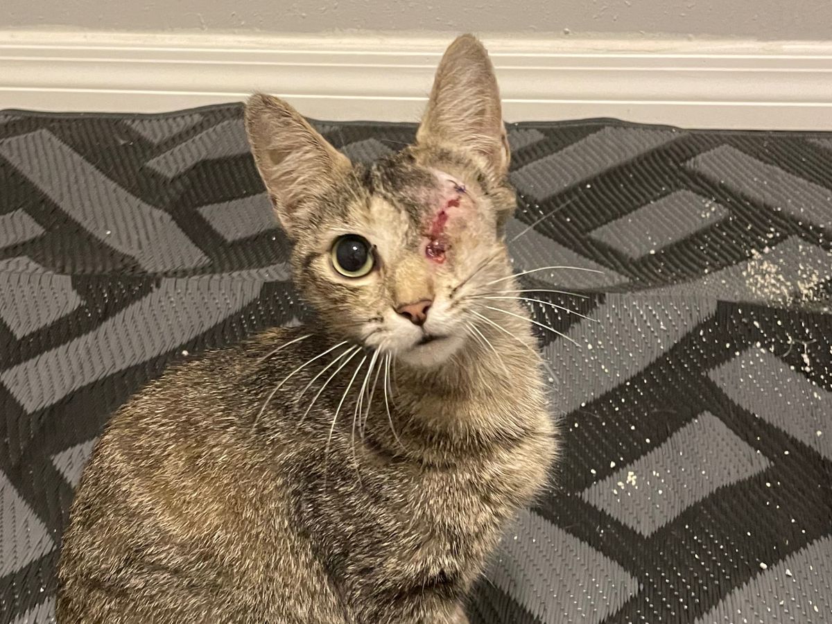 Recently she went missing for a few days and turned back up with a severe eye injury. It seems as if she was attacked by another animal while defending her kittens.