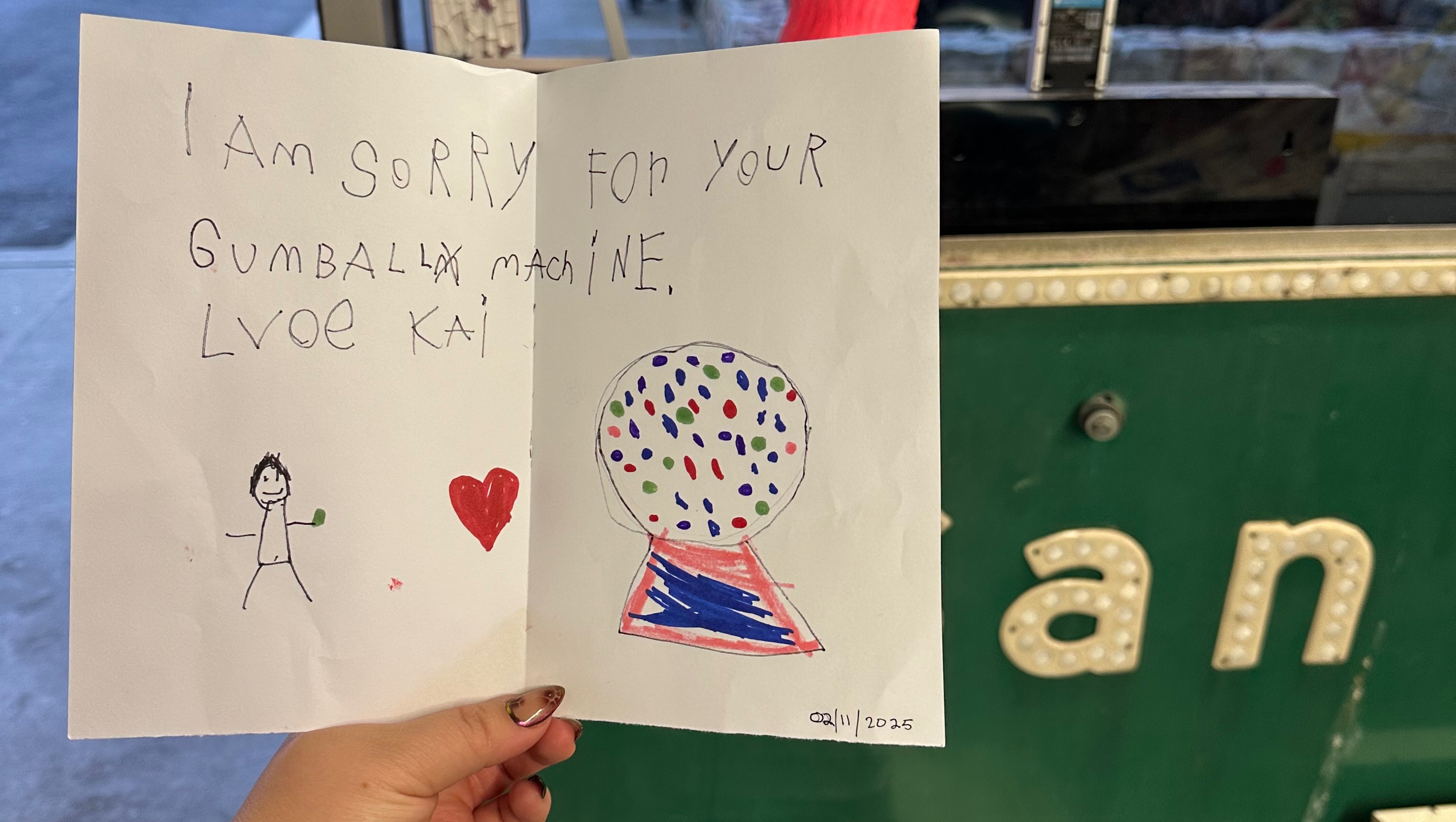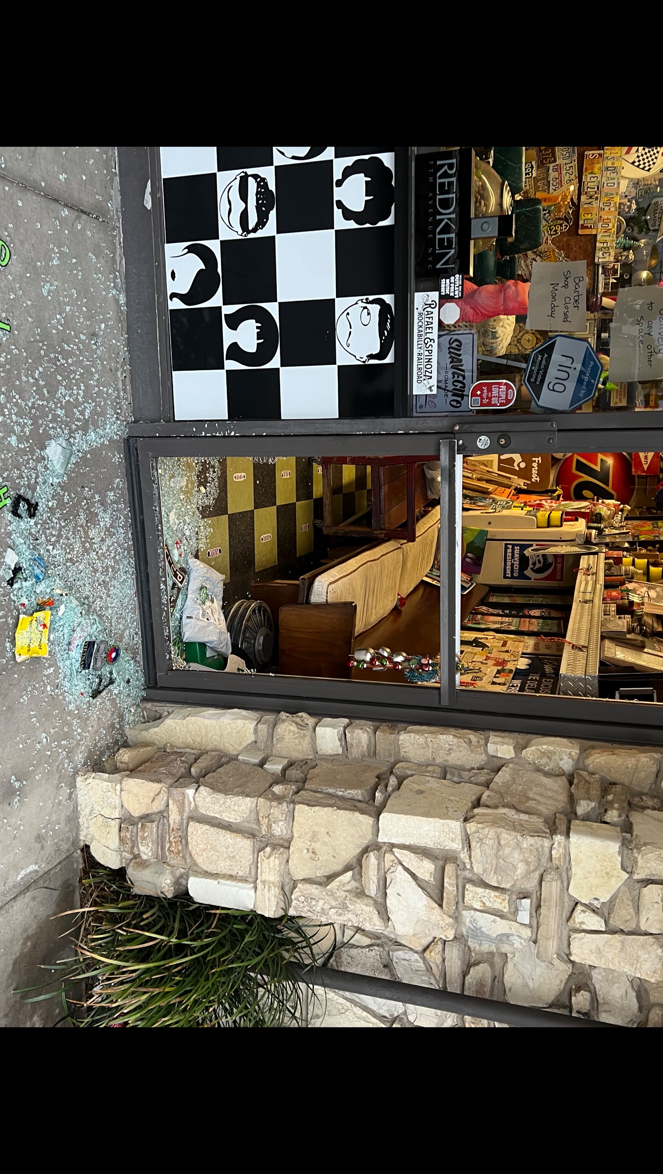 We never want to take things out of our shop because of the fear of someone breaking in. Our shop holds a lot of memories and memorabilia’s. This isn’t just a barbershop/salon this is a place of community; where generations of families have been coming here for years getting their haircut(s) or color. It’s a safe space where people feel comfortable to tell us their “firsts”. “I bought my first house. I’m pregnant for the first time. I’m traveling the world by myself. I’ve been diagnosed with cancer. I gave my life to Christ.” Many first’s happen in our chairs. It’s why this place is so special to us and even more to Chad. We have kids that come in the shop and enjoy all the things that we have. And some on the spectrum that the first thing they do when they walk in, is go straight to our guitar collection and drums. The smile on their faces, that’s the peace and comfort they feel when they’re in our shop. Every single one of you makes our space so special. We never thought the silent intrusion, a shadowed guest who slipped through the cracks and broke every single one of our glass windows and doors would bring fear into a place we trusted. Chad has been in this shop for 35 years and never once has he been violated in such a way. And in the past 4 weeks we’ve been broken into three times. We never wanted to be a shop that had to resort to security bars over our doors. But being violated 3 times in less than 2 months gives us no choice. I tried hard to figure out a way to end this but I will end this with a piece of art work that a kid brought us today when he found out our gum ball machine was stolen.