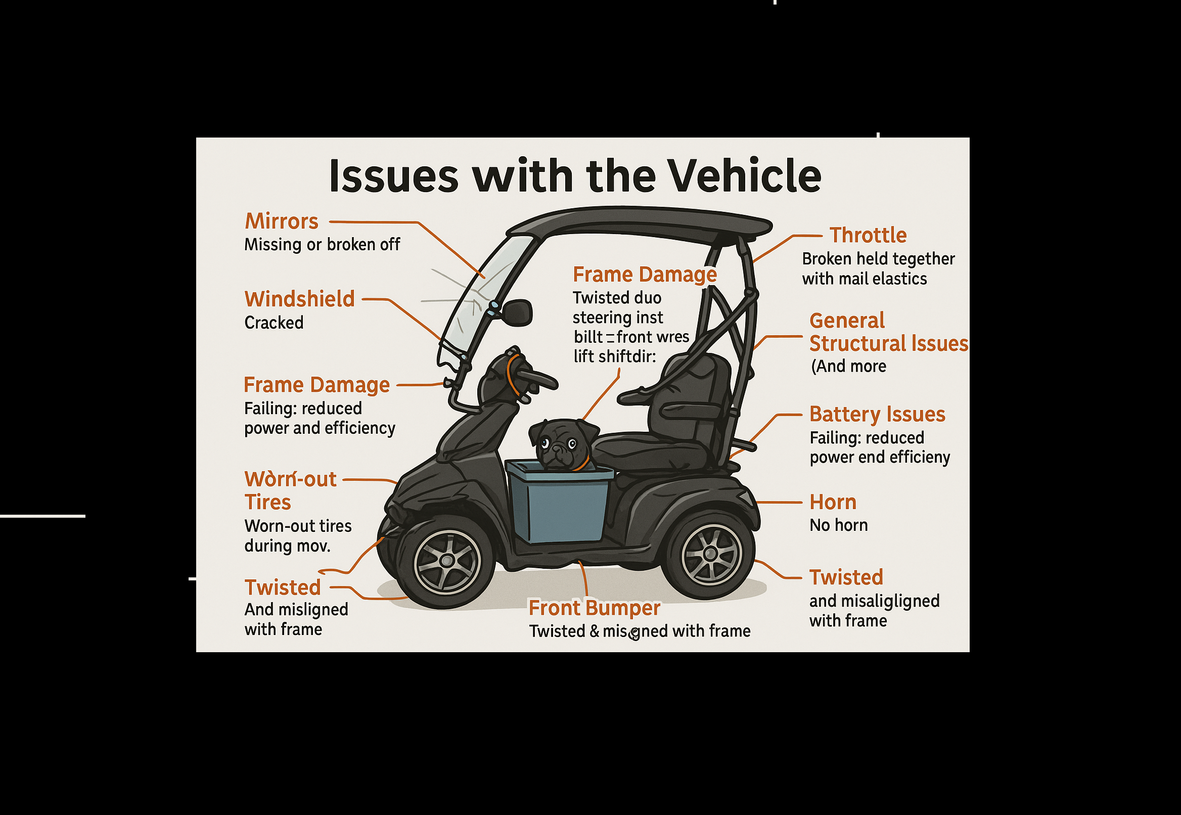 The shocks are shot, the frame scrapes when I turn, the batteries are on their last legs, and the roof and windshield are cracked. The list of repairs keeps growing, and sadly, fixing it all would cost more than simply replacing the scooter.